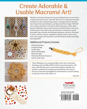 Adorable Macramé shows how easy it is to make super cute macrame projects! Ranging from jewelry and home décor to ornaments, plant hangers, coasters, and so much more, learn how to use natural macramé cord to create tons of bohemian-inspired items. Featuring over 20 unique and charming projects with step-by-step instructions and coordinating illustrations to walk you through the design from start to finish, this exciting and approachable guide is the perfect resource for anyone looking to learn how to macrame on a smaller scale. Author Stacy Malimban is the author of Knotting Bags and Belts and continues to share her charming expertise within the pages so you can add creative DIY touches to your life!