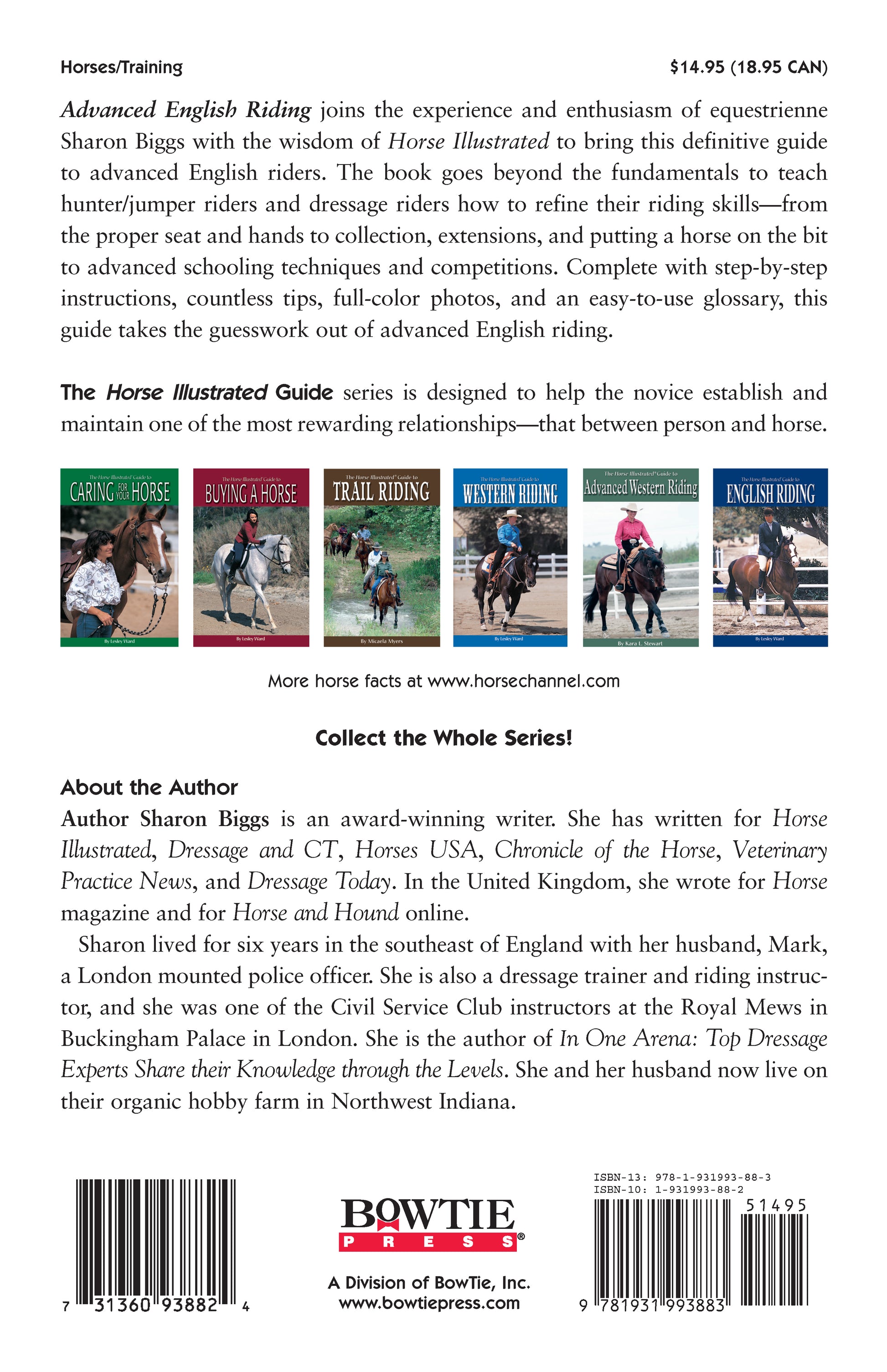 An advanced rider, whether professional horseman, Olympic athlete, or just a horse lover who has learned the fundamentals and go on to ride his or her own horse, in the author’s view, ?is someone who graps the idea of good horsemanship and puts a great deal of time and effort into developing his or her seat and position.” Advanced English Riding is designed to helped riders develop those skills and to help them move on to the next level of riding. Author Sharon Biggs, whose credits also include The Original Horse Bible, shares her considerable experience in English riding in this Horse Illustrated Guide that goes beyond the fundamentals to refine the riding skills of hunter/jumper riders and dressage riders, from improving seat and position to advanced schooling techniques and participating successfully and joyfully in competitions. This book offers step-by-step instructions and great advice for all English riders looking to develop, improve, or refine their skills in the various aspects of this popular riding discipline. This extensive guide is divided into 15 chapters and covers the following topics: honing the seat and position, the half halt, riding within the gaits (transitions, stride adjustment, collection, extensions, etc.), riding figures, lateral work,