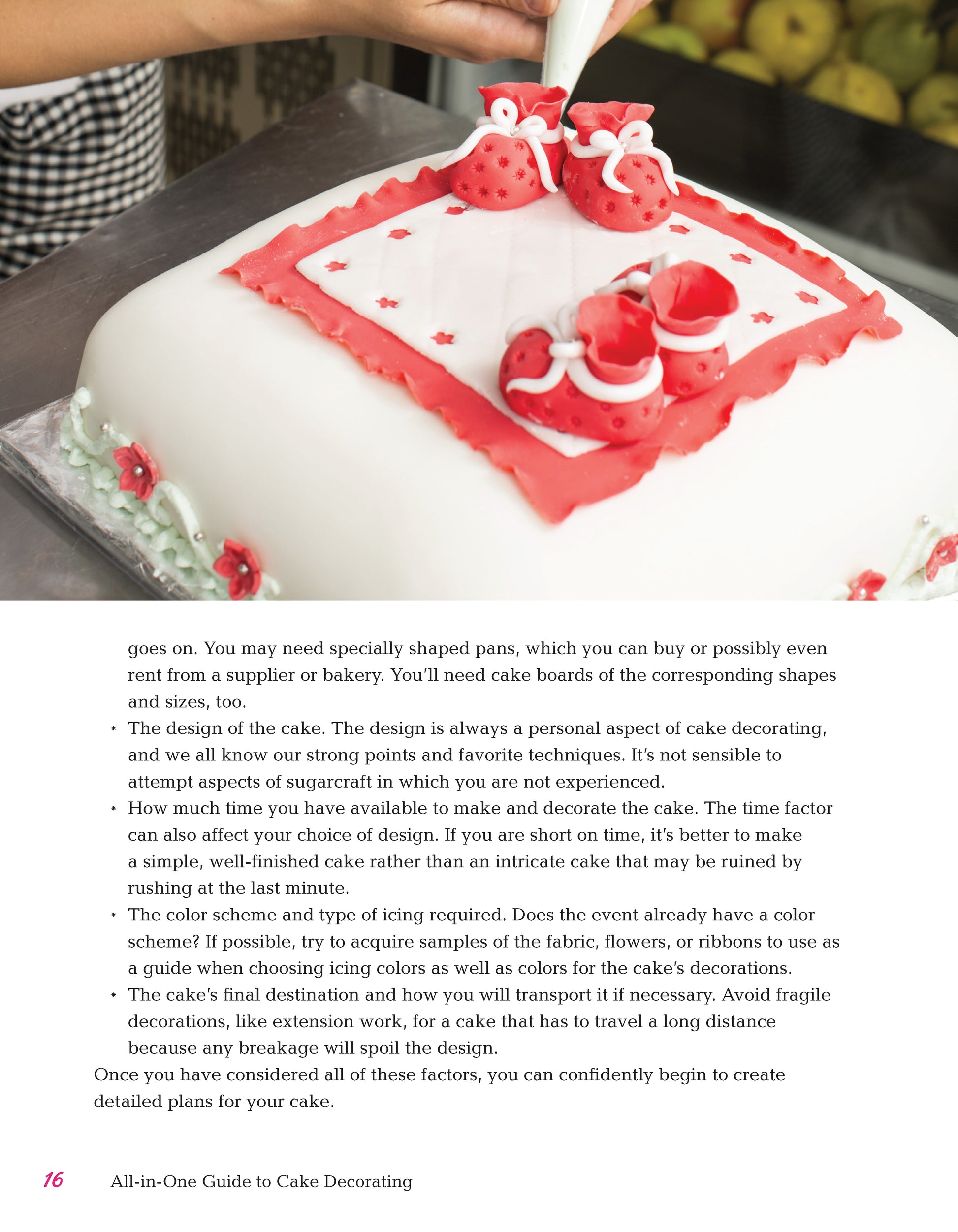 This comprehensive and accessible guide to cake decorating teaches all of the techniques and tricks that aspiring sugarcrafters need to create stunning and impressive cakes. Everyone will think these amazing cakes came from the best bakery in town! First Steps in Cake Decorating reveals dozens of expert cake decorating ideas that are simple to achieve yet look stunning. All the most popular methods of icing and decoration are covered, including buttercream, sugarpaste, chocolate, marzipan and flower paste. Detailed, easy-to-follow instructions explain the basics of preparing and using different types of icing, illustrated with step-by-step color photographs. There is a delicious array of fantastic cakes here to suit adults and children alike. Beginners will pick up the basics fast, and even experienced cake decorators will find inspirational new ideas. About All-in-One Guide to Cake Decorating: A complete, structured course in the beautiful art of cake decorating from first steps to expert skills. Teaches techniques that can be used to decorate all kinds of cake from a novelty birthday cake to a memorable wedding cake. Over 300 instructional step-by-step color photographs show how to decorate more than 50 finished cakes. Clearly written, straightforward text covers every aspect of sugarcrafting skill. Includes covering