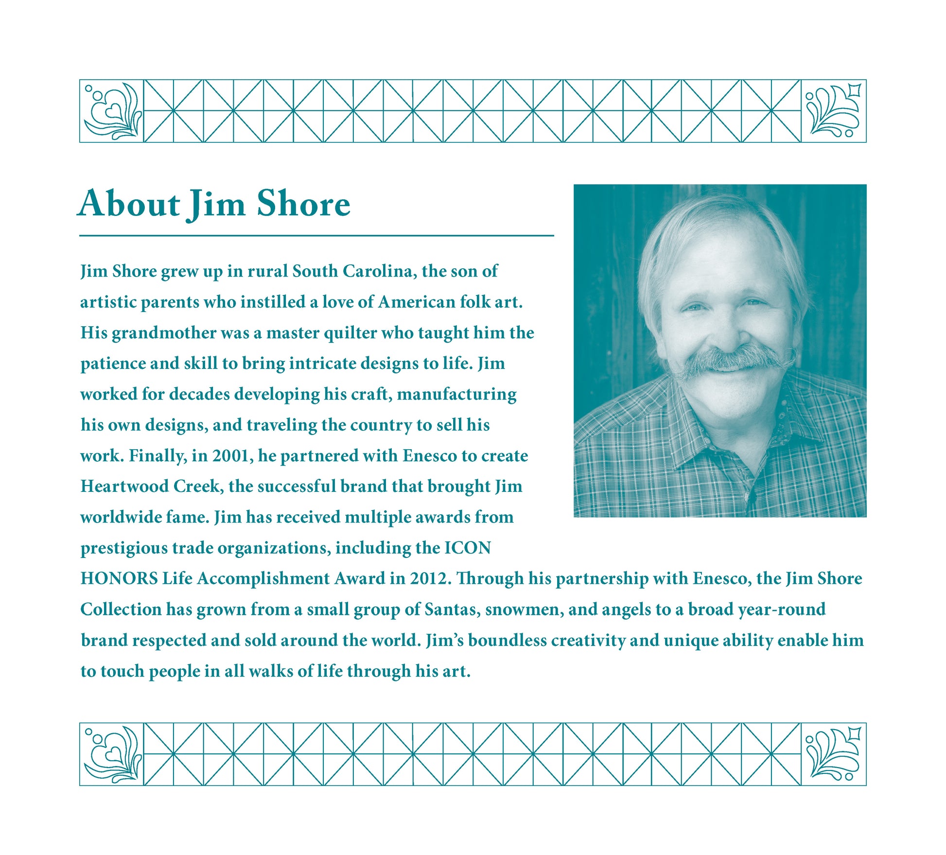 Jim Shore is a renowned artist and legend in the giftware industry, inspiring retailers and consumers alike with an enduring body of work based on tradition, family, and love of country. A sculptor and painter specializing in collectible and figurines, Jim’s unmistakable style combines a diverse color palette with timeless design drawn from images of American and European folk art forms, including quilting, rosemaling, and tole painting. He designs under Enesco, a gift industry retail distributor, and is a best-selling artist with QVC. He has done commissioned work for Disney, Peanuts, Coca Cola, The Grinch, and several other famous collections. To see more of Jim’s work, visit his website (www.JimShore.com), Facebook (@ArtistJimShore), and Instagram (@jim_shore_designs)