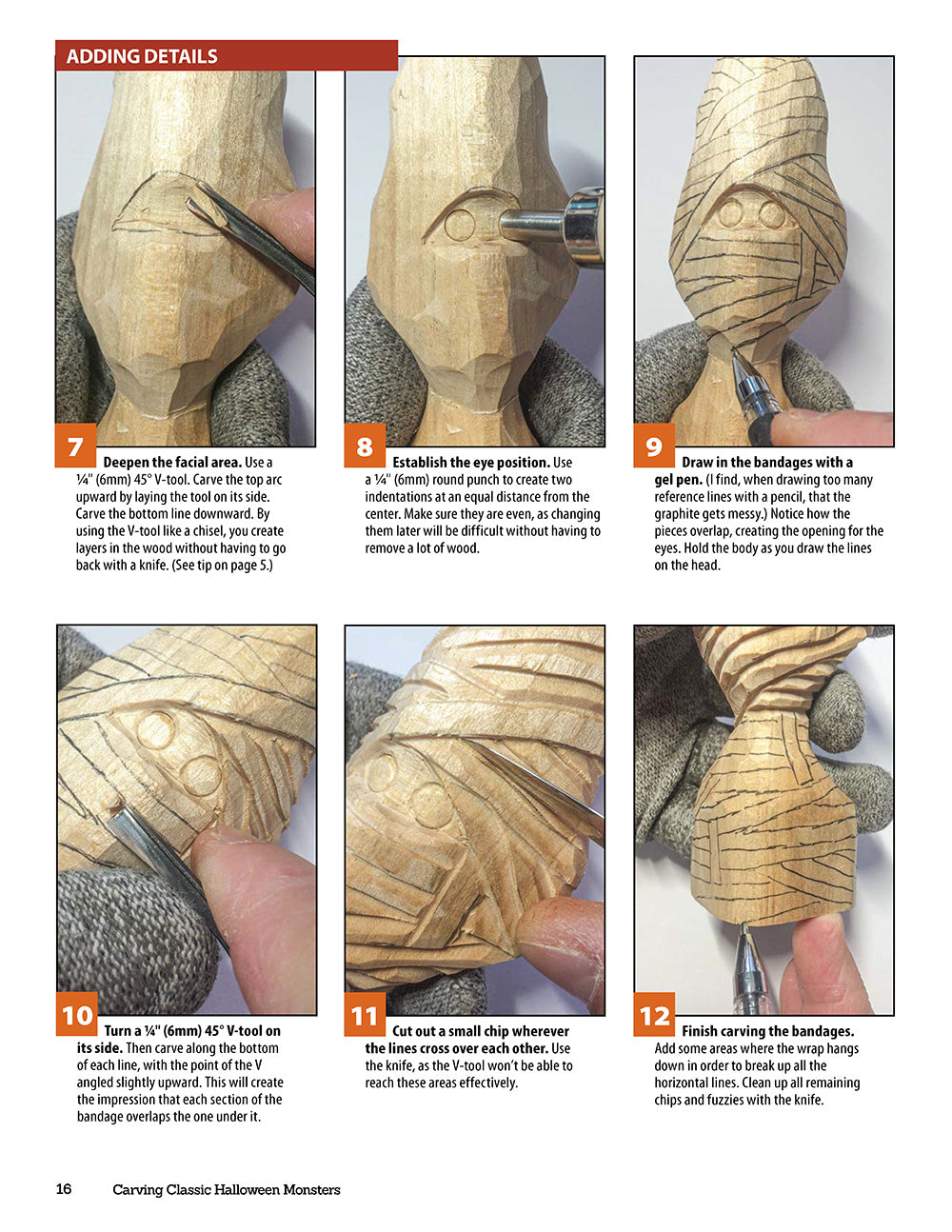 Challenge your carving skills as Halloween creeps near! Author and award-winning caricature carver Dwayne Gosnell will skillfully teach you how to carve, paint, and finish 4 classic monsters, including Dracula, Frankenstein, a witch, and a mummy. With detailed, step-by-step instructions and photography, each task is carefully described, from roughing out to painting and finishing each piece. Full-size, ready-to-use patterns are provided for every project, as well as paint notes, expert tips, and complete tools and materials lists. Perfect for both beginners and experienced woodcarvers alike!