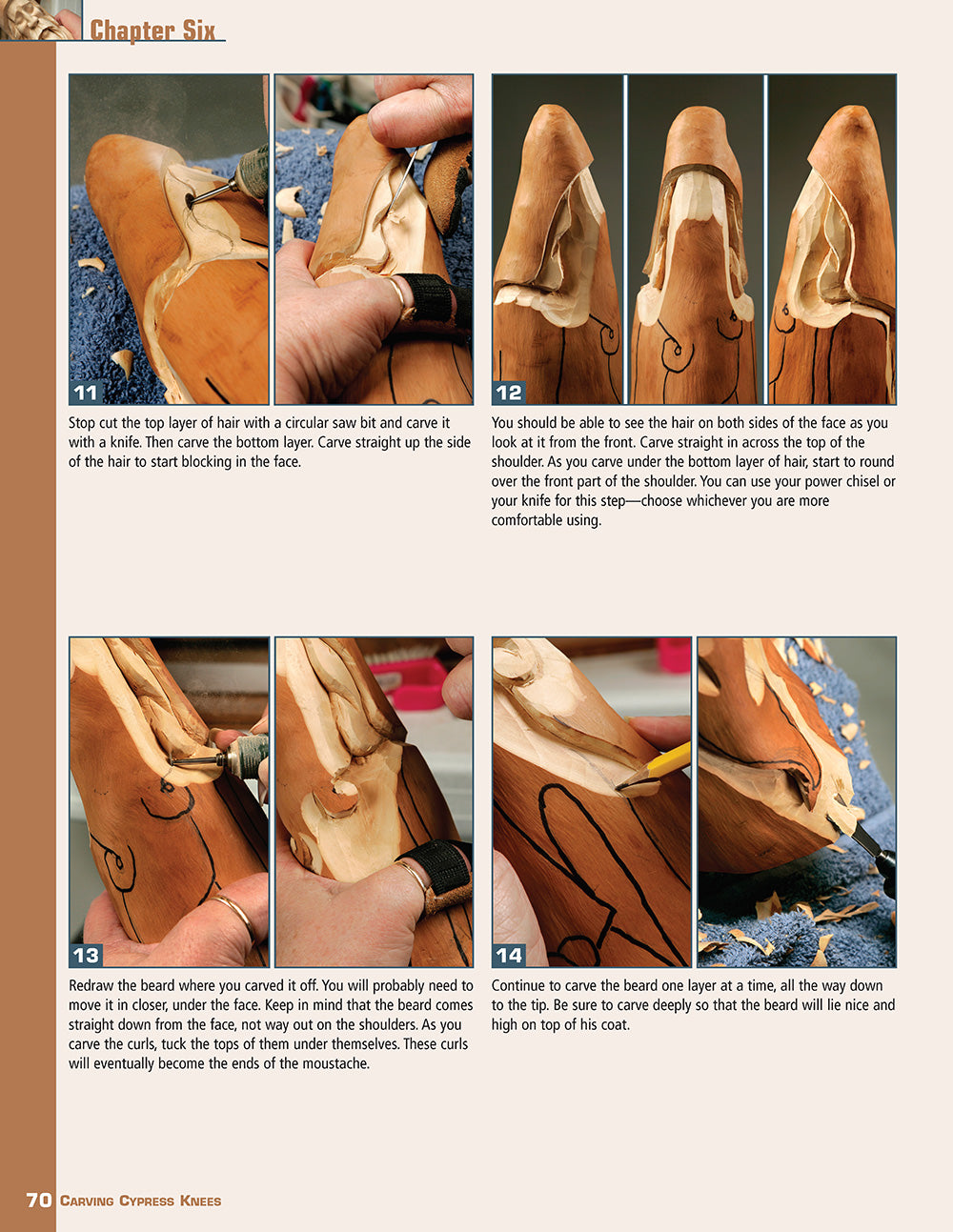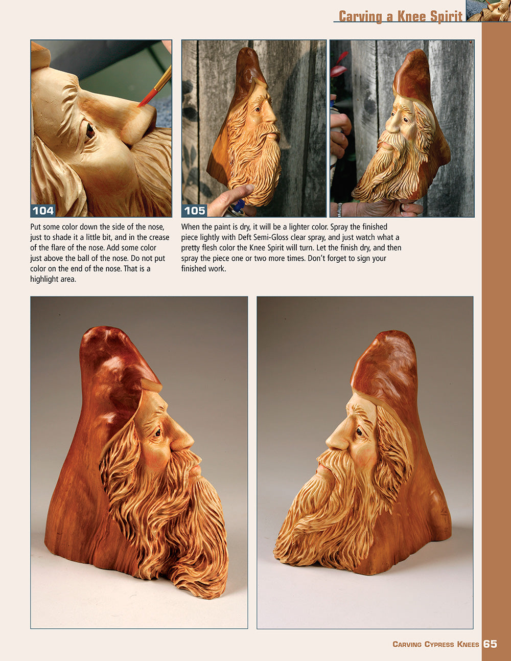 Carole Jean Boyd is an award-winning carver who specializes in carving cypress knees, spirit faces, and human hair. She lives in Millbrook, Alabama. | Jack A. Williams is a commercial photographer working from his studio in Knoxville, Tennessee. Photography was once a hobby for Jack until he discovered he could make a living doing what he enjoyed. He then needed a new hobby, so in 1973 he started woodcarving. His artistic talents have been demonstrated with a third Best of Show in the first National Caricature Carving Competition held at Silver Dollar City in Branson, Missouri; a Best of Show at the Ward Wildfowl Carving Competition in Ocean City, Maryland; Peoples and Carvers Choice and Best of Wood Sculpture at Dollywood in Pigeon Forge, Tennessee; and Best of Division at the International Woodcarvers Congress in Davenport, Iowa. Jack also won first place in the Flex-Cut Tool Internet Carving Competition in 2001. The year 2003 marks Jacks 12th year to coordinate the woodcarving show at Dollywood, which hosts The Great Pumpkin Carving Competition, and to coordinate the National Caricature Carving Competition. In 2003 Jack was elected to become a member of the Caricature Carvers of America and is President and one of the founders of the Tennessee Carvers Guild. Jack now spends a great deal of time photographing carvings at shows and for friends, and his photography appears frequently in many magazines on woodcarving and other subjects. Jack is a co-author of Carving Found Wood with Vic Hood and of The Illustrated Guide to Carving Tree Bark with Rick Jensen, both published by Fox Chapel Publishing Co., Inc