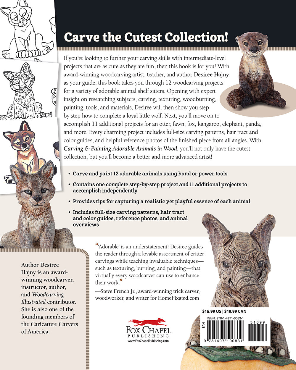 Adorable as they are advanced, this pattern book contains 12 woodcarving projects for a variety of animal shelf sitters. From pandas and foxes to raccoons, otters, and more, each design includes a pattern template, hair tract guide, and color chart for painting guidance. Follow step-by-step instructions to complete a charming wolf project, then accomplish the remaining animals on your own! With helpful tips and notes throughout to capture a realistic yet playful essence of each animal, this is the perfect book for woodcarvers looking for challenges to hone their skills. Author Desiree Hajny is an award-winning woodcarver, instructor, and Woodcarving Illustrated contributor. She is also one of the founding members of the Caricature Carvers of America.