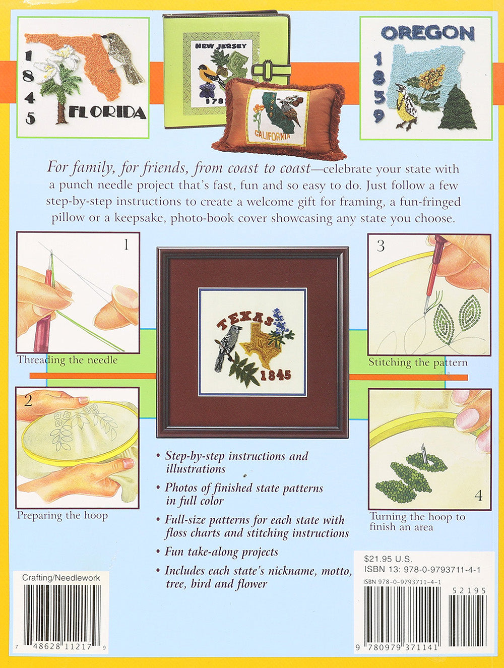 Punch needle your way across the United States in this fun collection of projects featuring the 50 states! Each pattern includes the state bird, flower, tree, and the year the state was admitted to the Union. With step-by-step instructions and illustrations, full-color photography of each completed project, full-size patterns that are reversed and ready to trace, floss charts, helpful tips and notes, and bonus project ideas, show your state pride or create meaningful gifts for friends and family across the country. Patterns are easy to adapt to hand or machine embroidery, and the easy-to-follow basic instructions will help you get started. Coast to Coast in Punch Needle is a creative, fun, and unique way to see America, all by way of needle and thread!