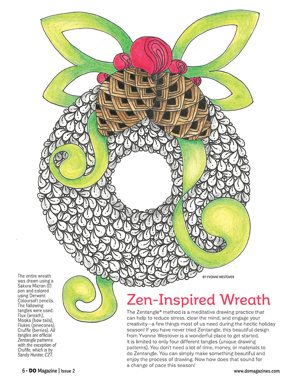 Color, tangle, craft, and doodle with this fun new bookazine from Design Originals, the original Zentangle® publisher! The Winter 2015 issue offers coloring pages, feature articles, craft projects, meditative drawing exercises, and artistic advice from best-selling artists and authors like Joanne Fink, Valentina Harper, Ben Kwok, Thaneeya McArdle, Debra Valencia, Jess Volinski, and more. It includes a user’s guide to coloring supplies, ready-to-color gift tags, a gift box pattern, a Zen-inspired holiday wreath project, and 24 tear-out coloring book pages printed on extra thick paper. Other special features include a profile of popular coloring book artist Millie Marotta, a user’s guide to coloring supplies, and a look at the therapeutic benefits of the coloring trend.