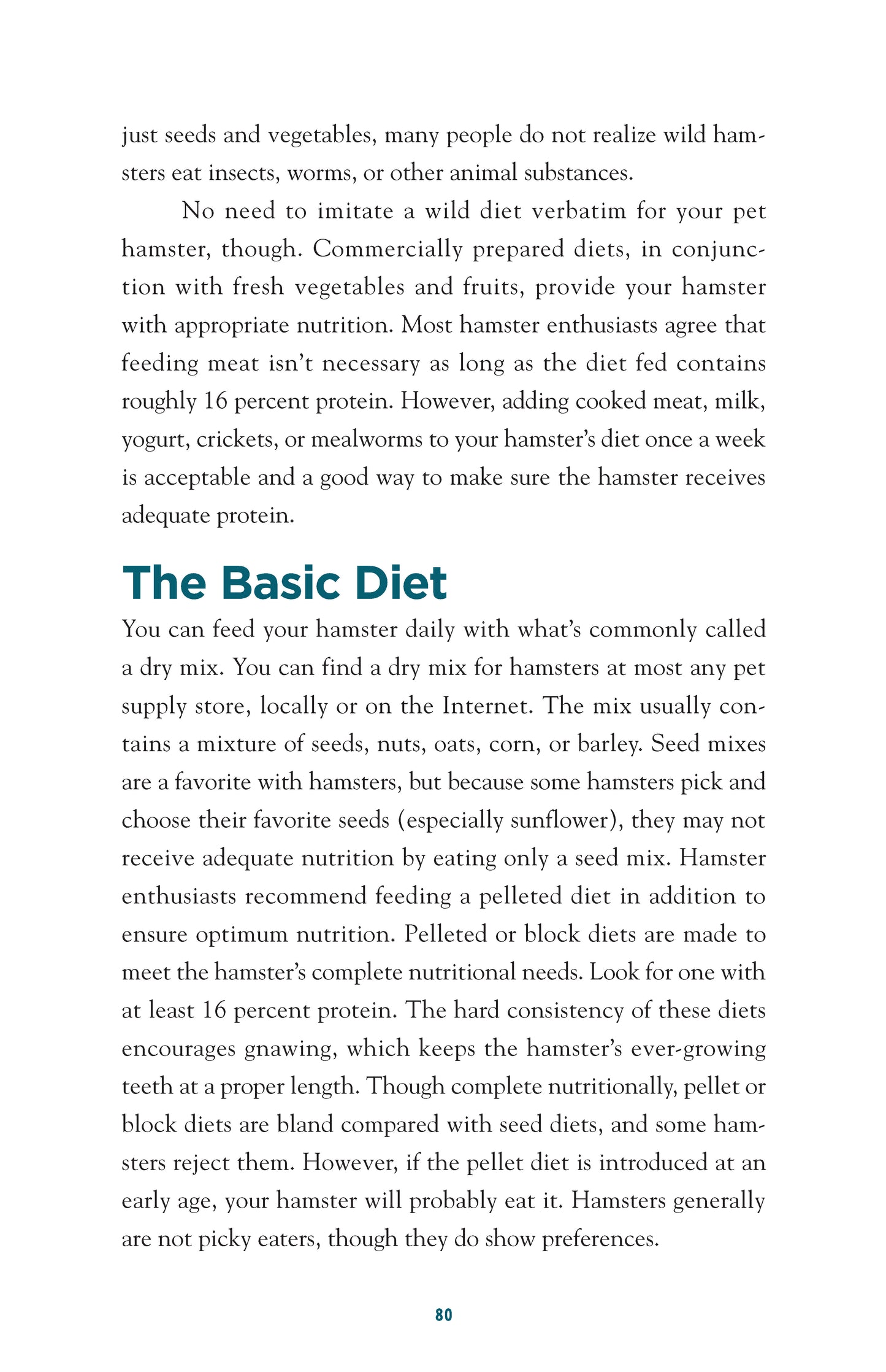 Ever since hamsters arrived in the United States in the 1950s, they have topped the list as America’s favorite critter. Hailed as ?the ultimate pocket pet,” hamsters are ?small, cute, fuzzy, clean, and easy to care for,” in the words of author Virginia Parker Guidry. Filled with terrific color photographs, this Complete Care Made Easy Hamsters encapsulates all the virtues of these flawless little mammals and gives owners practical advice about how to better understand them and properly care for them. Deciding to add a hamster to one’s household is the subject of the chapter ?The Right Choice,” which discusses the virtues of these easy-to-tame children’s pets and the commitment they require.The chapter ?Locating a Healthy Hamster” offers solid advice about selecting the right pet, where to purchase or adopt, and whether two (or three) is better than one. Two complete chapters on the hamster’s homecoming offer the reader excellent advice about acclimating the new pet to the home, selecting the best cage, accessories, setting up the hamster’s habitat, and finding a good vet. In ?Life with a Hamster,” the author discusses the hamster’s nocturnal nature, various physical behaviors, temperature requirements, handling, and basic husbandry. The hamster’s feeding requirements are