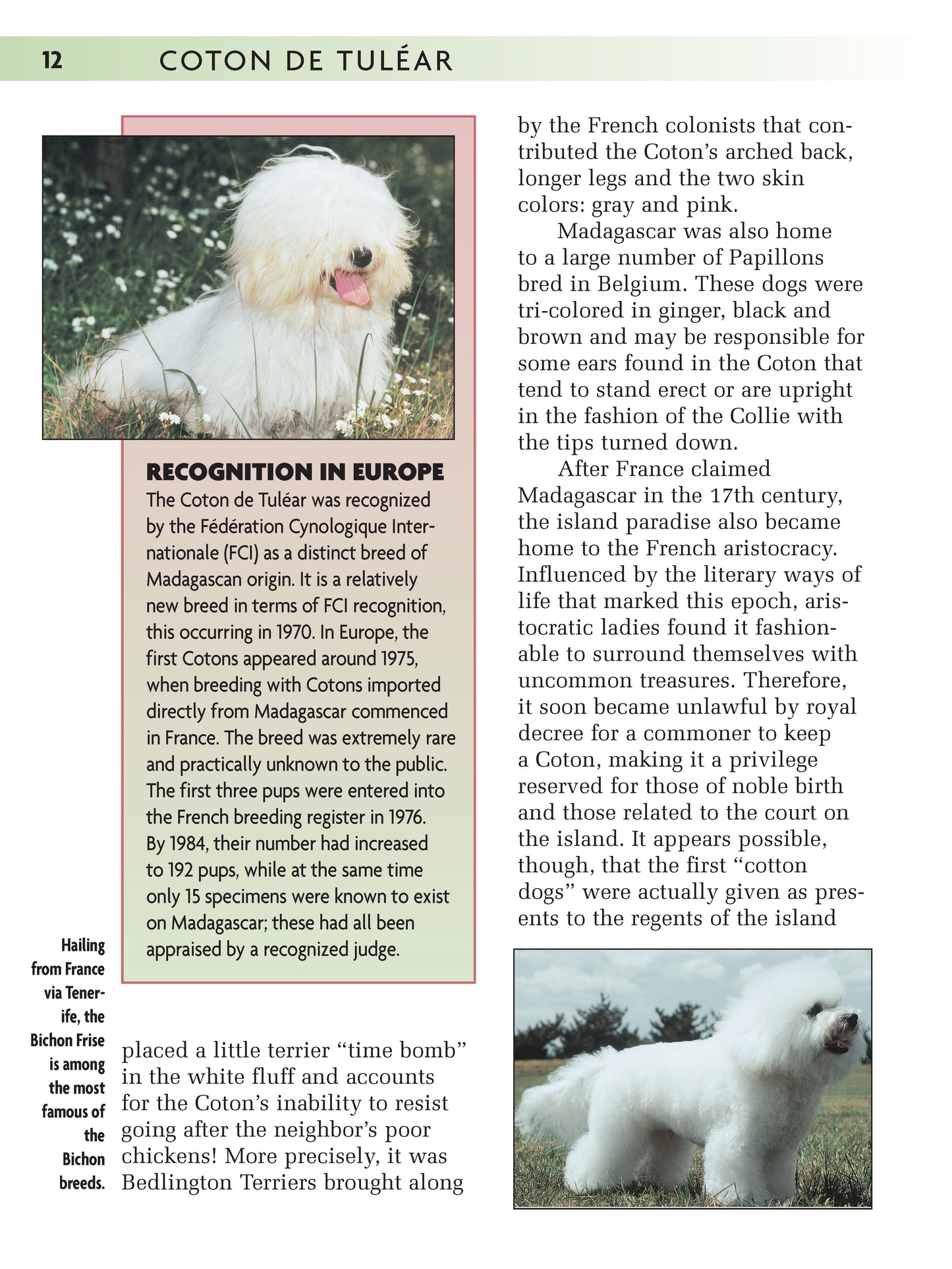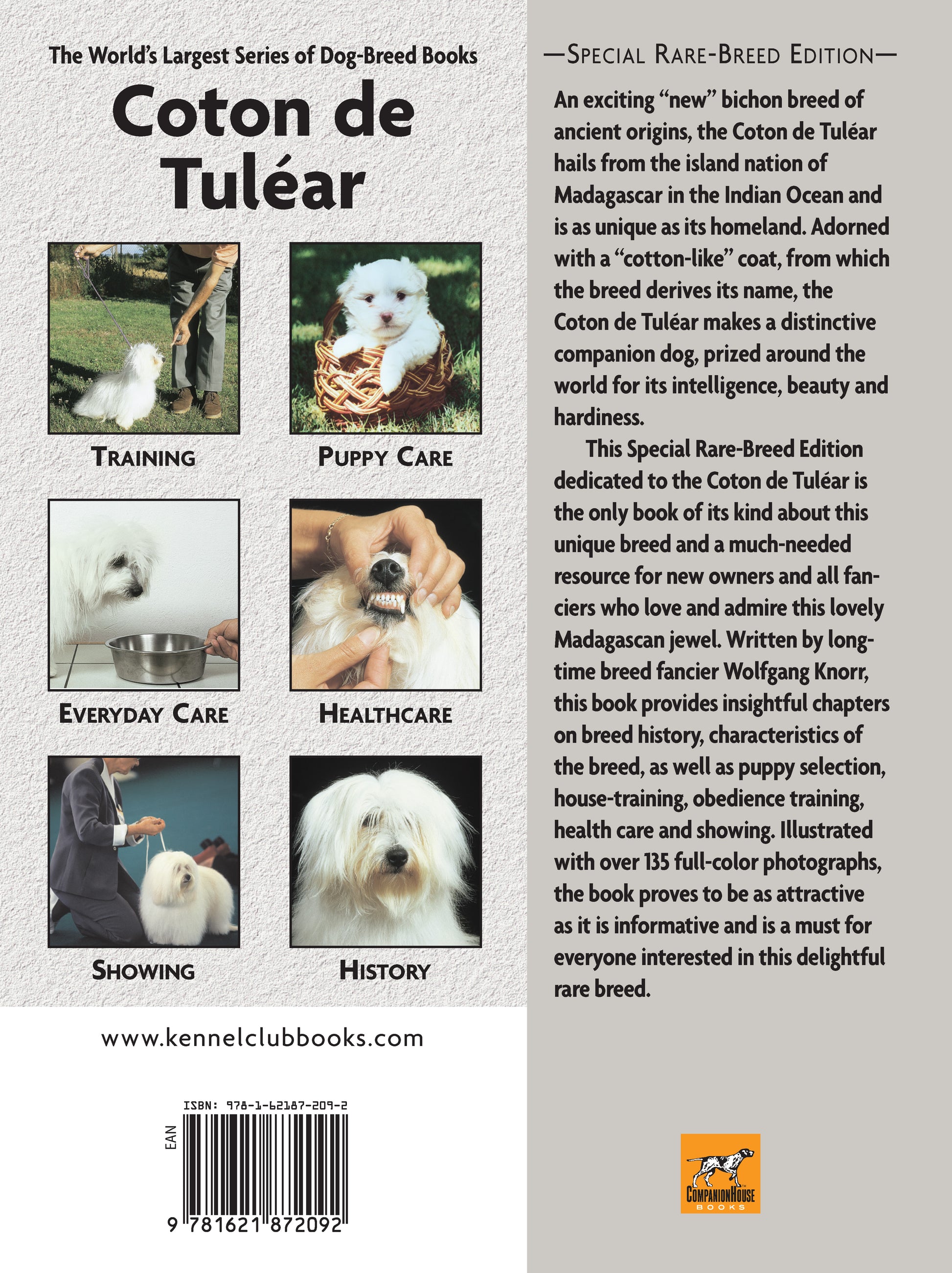 This Comprehensive Owner’s Guide dedicated to the Coton de Tuléar covers the history, characteristics, and breed standard of this unique toy breed from Madagascar. A rare breed similar to the Bichon Frisé and Maltese, the Coton de Tuléar has been swiftly growing in popularity around the world and especially in the United States. Written by breeder Wolfgang Knorr, this colorful guide offers new owners all the information they need to select and purchase an ideal Coton puppy as well as socialization, house-training and obedience training, and every-day care (feeding, grooming, exercise). An elaborate chapter on healthcare discusses the selection of a veterinarian, parasite prevention, and vaccinations, essential reading for all dog owners. Sidebars throughout offer helpful advice to readers about hundreds of topics. Fully indexed.
