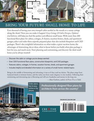 Ever dreamed of having your own cozy cabin nestled in the woods? Now you can make it happen! Recently updated with 35 new house plans, this book will help you find the perfect efficient small home! Featuring over 200 functional floor plans for cabins, cottages, a-frames, vacation homes, and apartment garages, select and order these expertly prepared plans that also include construction blueprints and CAD packages that will bring your future home to life. Also included in this updated edition are six new articles on a variety of insightful subjects, from vacation home ideas and maintenance to apartment garage décor ideas, tips before building a small shed or structure, and more. Stop dreaming and start planning with this essential guide and discover the ideal small home you’ve always wanted!