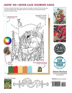 Discover a fabled dominion where Giants are a part of everyday life. In this imaginative coloring book, fantasy illustrator Eric Messinger takes you inside an alternate fantasy world of Kingdom Giants, Hill Giants, Mountain Giants, War Giants, and more. Ranging in mood from ferocious to gentle, these gargantuan humanoids are ready to color with markers, colored pencils, watercolors, or gel pens. Dominion of Giants Coloring Book includes handy guides to coloring techniques like patterning, combinations, and shading. Guided Coloring Pages make coloring easy for beginners, with beautifully colored examples and ready-to-use color palettes. Each design is printed on one side only of archival-grade, acid-free, 200-year paper, and perforated pages detach easily for gifting or display. This book has earned the DO Magazine Artist Fair Trade Seal of Approval.