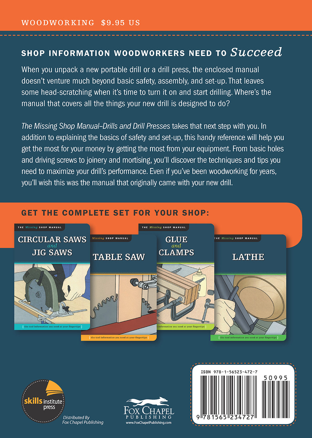 Knowing your tools is essential for every woodworker, and this is the one book you need to completely understand the drills and drill presses you own or are thinking of purchasing. Here is everything you want to know about drills with useful photographs and illustrations to accompany the clear and instructive text. For beginners, the book details important safety instructions for operating a drill and how to choose the correct field for the job you've planned. It does a great job explaining the difference between corded and cordless drills. Plus, you'll find the features you're most likely to actually need so you're not overpaying for unnecessary bells and whistles when buying tools. After helping you select your drill, the book dives into how to choose drill bits. Don't worry about getting lost in complicated terms. This book is designed to guide, not confuse. You'll even learn how to sharpen your drill bits! Here is how to effectively and safely use your drill for your more common needs, such as wood joinery, as well as tips on repair and renovations. You'll find instruction on how to select and use a drill press as well as basic cabinet making. Get inspired by