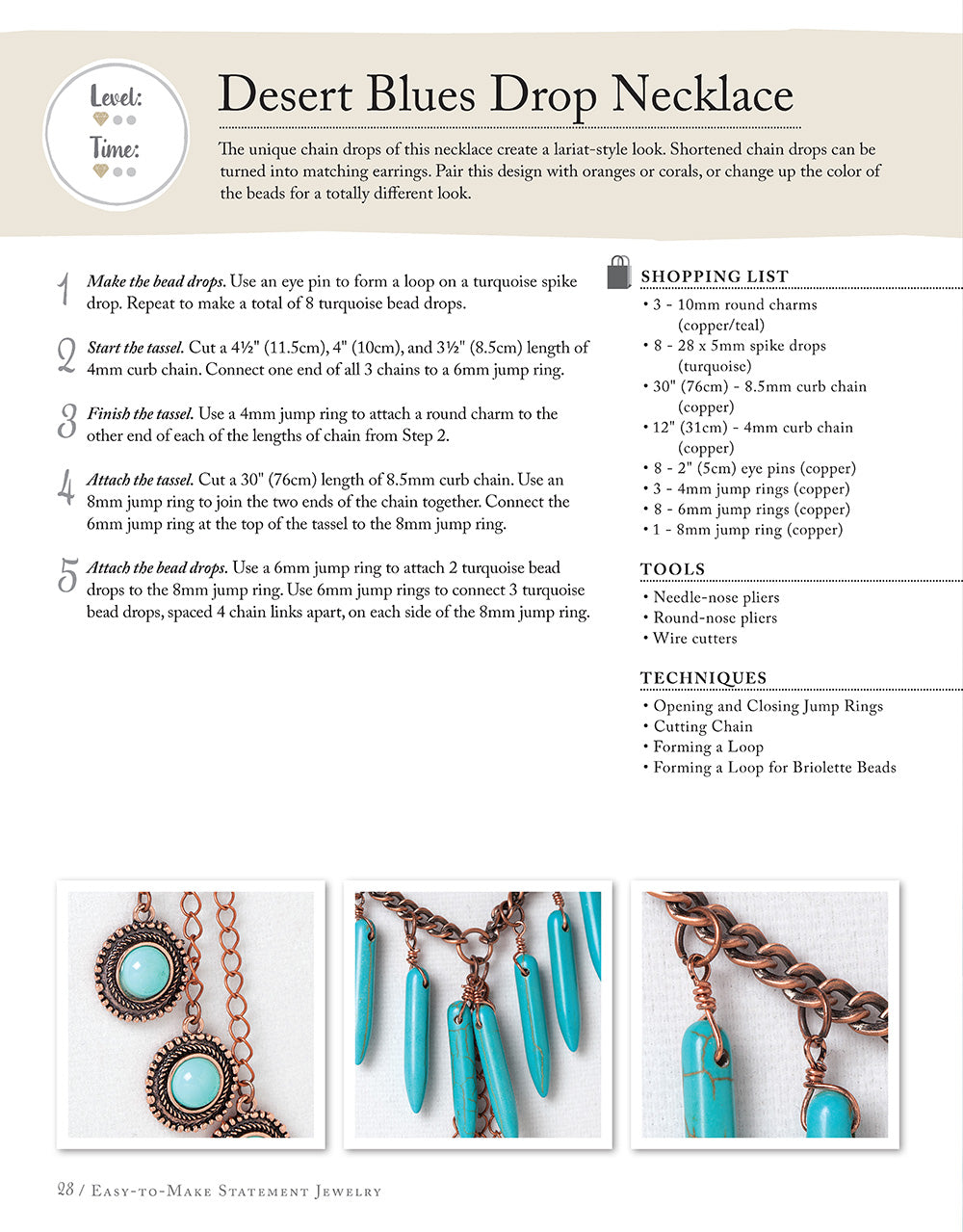 Style up with bold accessories that you make yourself! DIY Bold & Beautiful Necklaces offers 20 unique jewelry projects that you can create in just one afternoon. From chunky stone and edgy angles to vintage charm, each of these standout necklaces will add instant drama to the simplest of outfits. Even if you never made a necklace before, step-by-step photographs and simple instructions get you started. The authors explain all of the basic techniques you need to know, including crimps, loops, cutting chain, wrapping wire, and more. Projects are arranged by level of difficulty—from beginner through intermediate and advanced—and use only inexpensive materials that can be easily found in craft and hobby stores.
