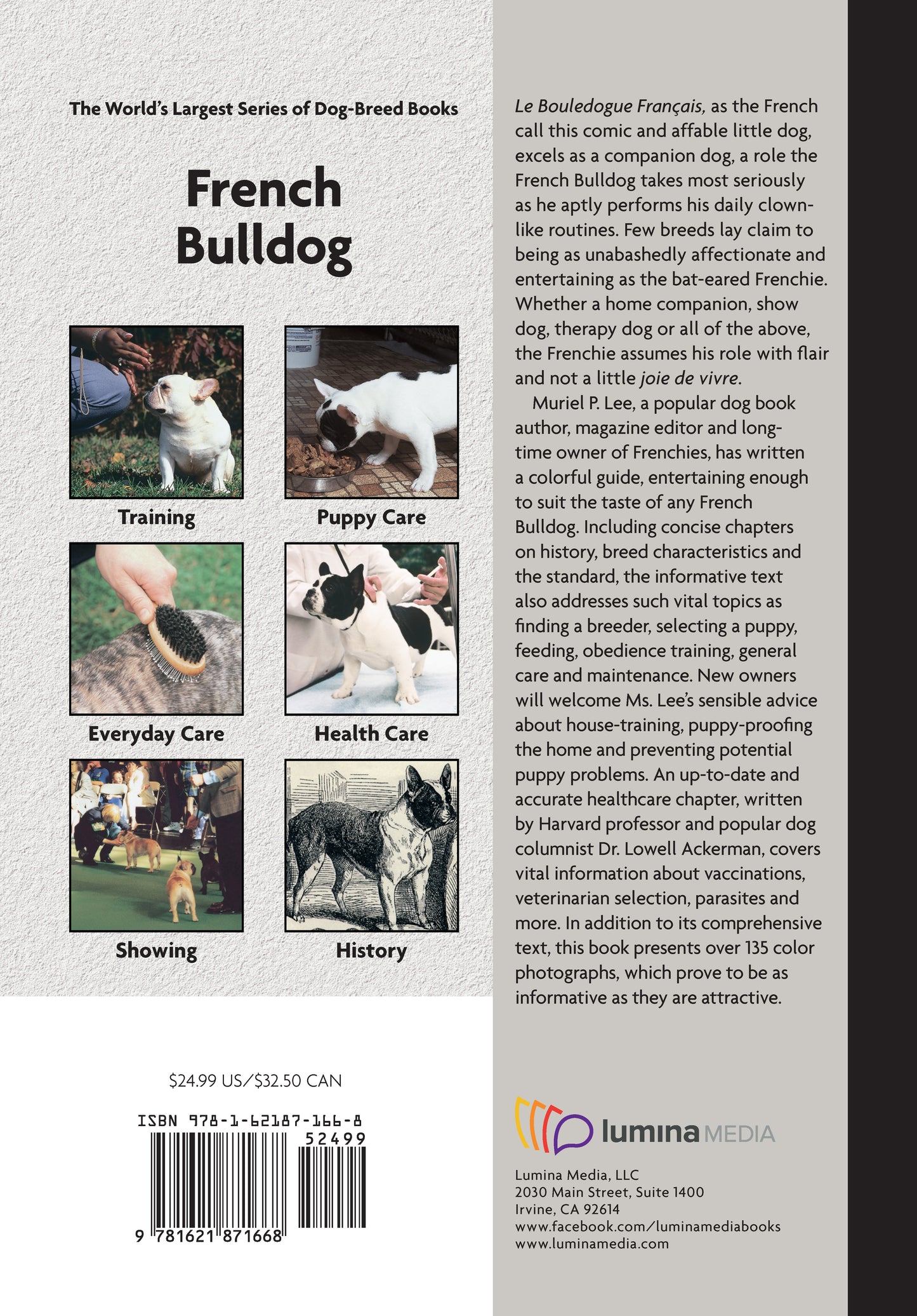 The French call him le Bouledogue Français, the miniature bulldog prized for his affable personality, comical behavior, and almost ineffable cuteness. The French Bulldog is an unabashedly affectionate and entertaining companion dog that assumes his role as family clown with flair and not a little joie de vivre. Frenchie enthusiast, owner, and author, Muriel P. Lee has written a colorful and entertaining guide about her favorite breed, beginning with a chapter that retells the breed’s first one hundred years in France, England, and America, accompanied by historical photographs that represent breed members from the early years. The chapter on the Frenchie’s characteristics talks about the qualities of this ?companion dog?nothing more, nothing less,” a sophisticated, smart ami (friend) to everyone he meets. The author extols the many virtues of the Frenchie (and warns about his few drawbacks), giving the reader sensible advice about whether or not this charming dog would make a good addition to his or her household. New owners will welcome the well-prepared chapter on finding a reputable breeder and selecting a healthy, sound puppy. Chapters on puppy-proofing the home and yard, purchasing the right supplies for the puppy as well as house-training, feeding, and grooming are illustrated