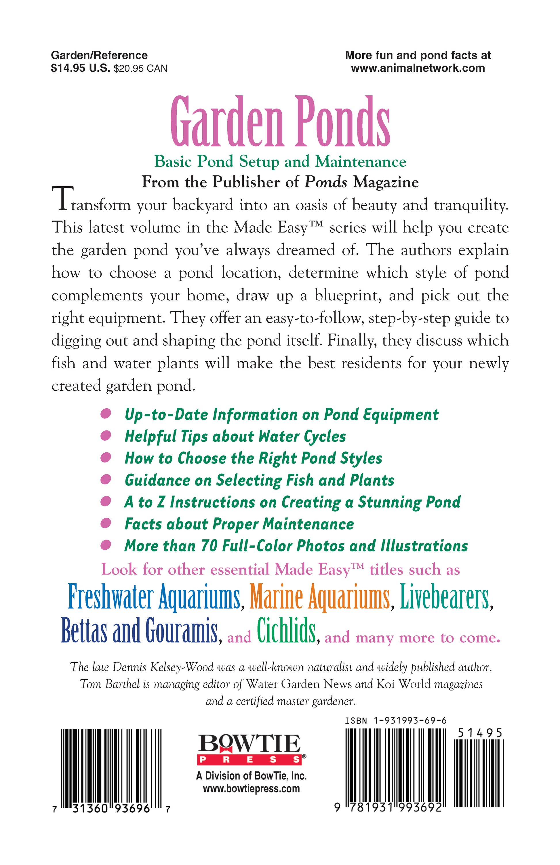 | Dennis Kelsey-Wood was a well-known naturalist and widely published author. Tom Barthel is managing editor of Water Garden News and Koi World magazines. A certified master gardener and journalist specializing in animal topics, he has authored numerous articles on fish, birds, small mammals, reptiles and other subjects. He lives in Long Beach, California, with his wife Rachel, where he enjoys his formal Spanish-Mediterranean garden pond