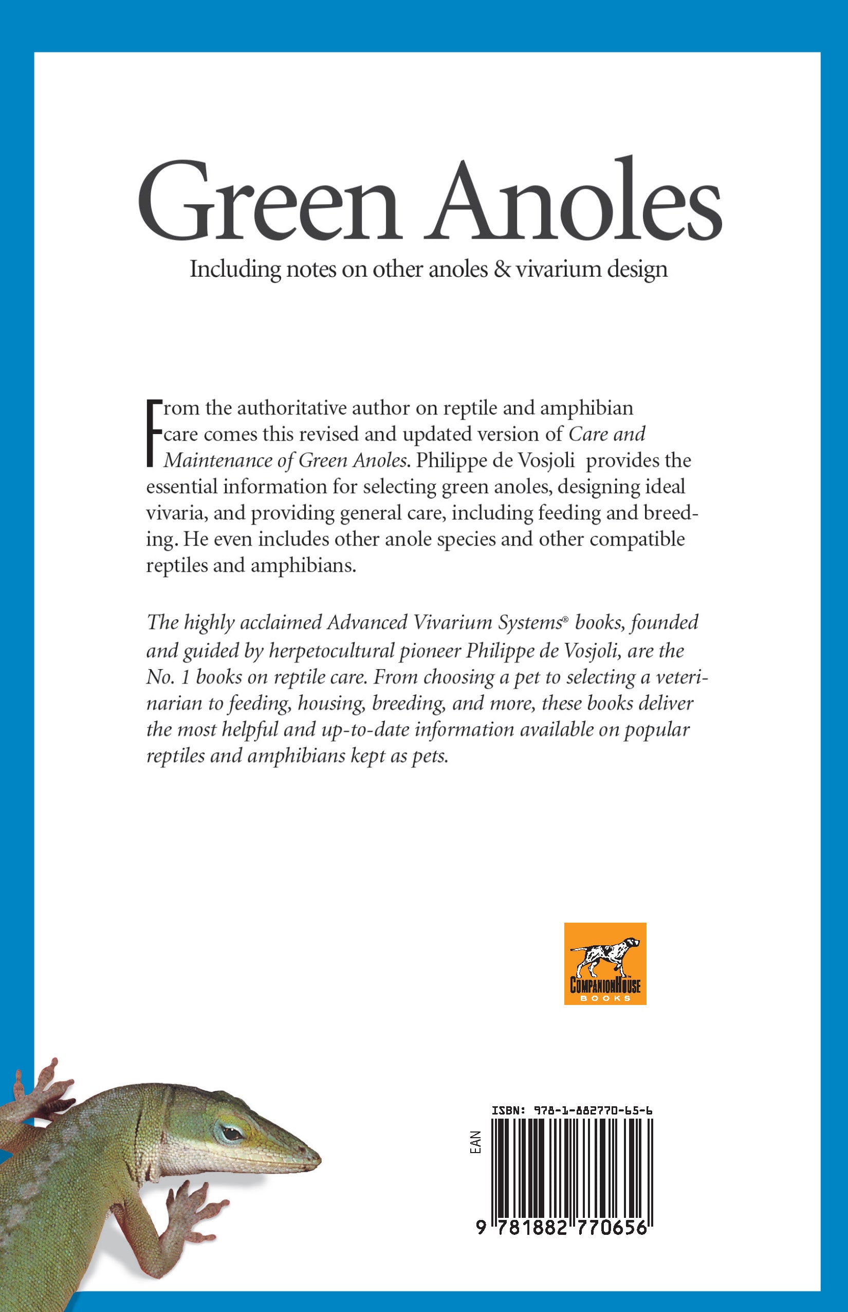 A popular beginner’s lizard, the green anole is the perfect introduction to the world of reptiles and continues to be popular among new herp lovers. These tiny, neat little lizards with the intense black eyes have suffered the fate of goldfish, as they’ve been marketed by pet shops as cheap, easy care, insect-eating reptiles. In order to keep green anoles thriving in their vivaria, pet owners must approach their husbandry with care and respect: Philippe de Vosjoli’s Green Anoles provides the precise information necessary to reach that goal. The book begins with a chapter about the characteristics and behavior, natural history, and anatomy of green anoles, all of which is critical information for a keep to better understand the needs of his or her pet. As pets, green anoles are best kept in their vivaria and not handled, so the setup of a beautifully landscaped vivarium with proper lighting, heat, humidity, ventilation, and substrate is key. This Advanced Vivarium Systems title offers complete information about housing, feeding and nutrition, diseases and disorders, and breeding as well as how to set up naturalistic vivaria for one or more anoles or a community of anoles and compatible species. The chapter on other