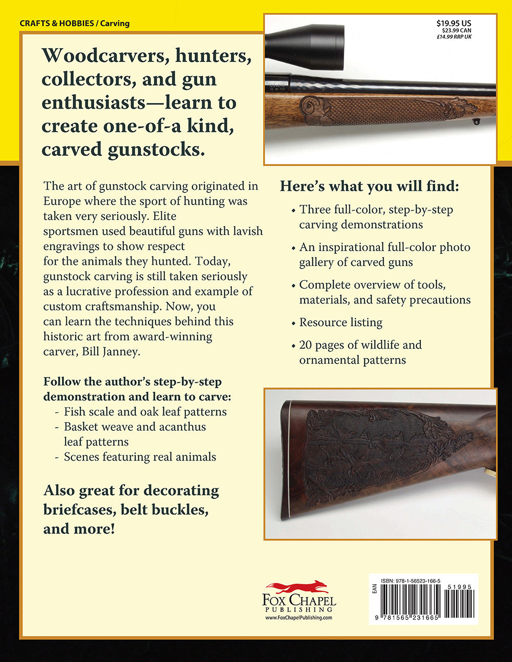 Learn to create one-of-a kind, carved gunstocks with this complete guide from award-winning carver Bill Janney. Includes step-by-step carving demonstrations, 20 pages of wildlife and ornamental patterns, and an overview of tools, materials, and safety precautions.