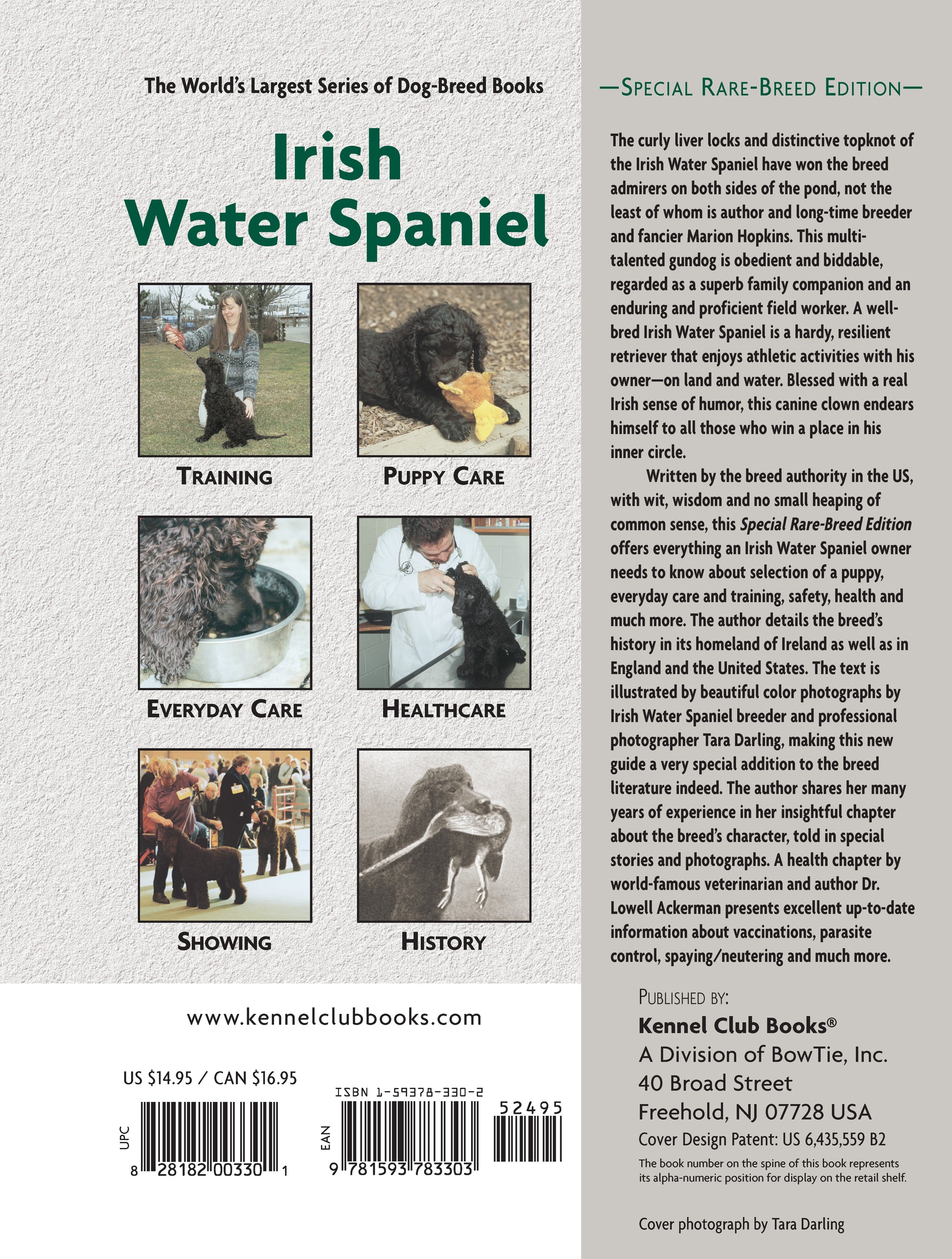 The Irish Water Spaniel’s curly liver locks and distinctive topknot have won the breed admirers on both sides of the pond, not the least of whom is author and longtime breeder Marion Hopkins, regarded as the IWS authority in America. Regarded as a superb family companion and an enduring and proficient field worker, the Irish Water Spaniel is a hardy, resilient retriever and an obedient and biddable companion that enjoys athletic activities with his owner?on land and water. Written with wit, wisdom, and no small heaping of common sense, this Comprehensive Owner’s Guide details the breed’s history in its homeland as well as in England and the United States. The text is illustrated by beautiful color photographs by IWS breeder and photographer Tara Darling, making this book as attractive as it is authoritative. A true fan of this charming Irish breed, the author shares her many years of experience with IWSs in her insightful chapter about the breed’s characteristics. As evidenced in the Hopkins’s special stories and Darling’s photographs, the IWS is a true canine clown, blessed with a real Irish sense of humor, that endears himself to all those who win a place in his inner circle.New owners will