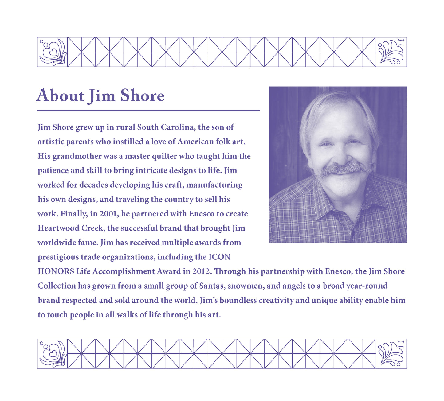 Jim Shore is a renowned artist and legend in the giftware industry, inspiring retailers and consumers alike with an enduring body of work based on tradition, family, and love of country. A sculptor and painter specializing in collectible and figurines, Jim’s unmistakable style combines a diverse color palette with timeless design drawn from images of American and European folk art forms, including quilting, rosemaling, and tole painting. He designs under Enesco, a gift industry retail distributor, and is a best-selling artist with QVC. He has done commissioned work for Disney, Peanuts, Coca Cola, The Grinch, and several other famous collections. To see more of Jim’s work, visit his website (www.JimShore.com), Facebook (@ArtistJimShore), and Instagram (@jim_shore_designs)