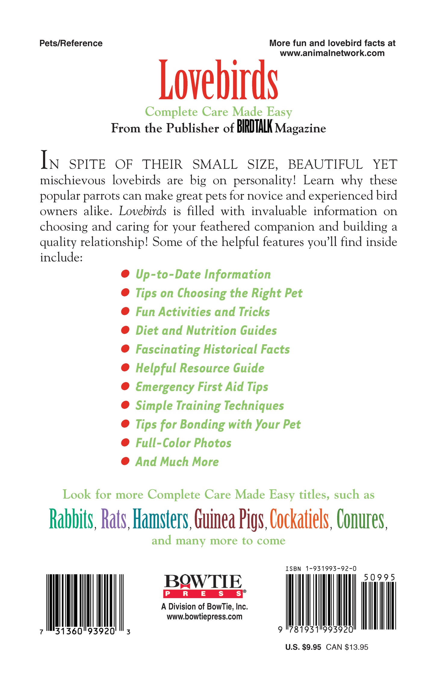 Author Nikki Moustaki certainly cannot resist the splendid lovebird, and her valentine to this irresistible avian wonder is the subject of this Complete Care Made Easy pet guide. This colorful guide offers vital information to both new and experienced bird keepers about this hookbilled parrot, covering all aspects of selecting, caring for, and maintaining well-behaved happy pet birds.Bird specialist and trainer Moustaki has written an ideal introductory pet guide about lovebirds with chapters on the history and characteristics of lovebirds, selection of a healthy, typical pet bird, housing and care, feeding, training, and health care.The chapter ?A Look at Lovebird Species” gives readers a glimpse into all nine species. Although nine species exist--ranging from red faced to black collared lovebirds ?only the peach-faced, black-masked, and Fischer’s are widely available to pet owners.The selection chapter offers potential owners excellent advice about the three main species of lovebirds and how to select the best one from those available commercially.In the chapter on housing and care, the author discusses selection of the right cage, placement of the cage, and all the necessary accessories. A bird’s diet is critical to its ongoing health, and the chapter devoted to feeding gives the reader all the