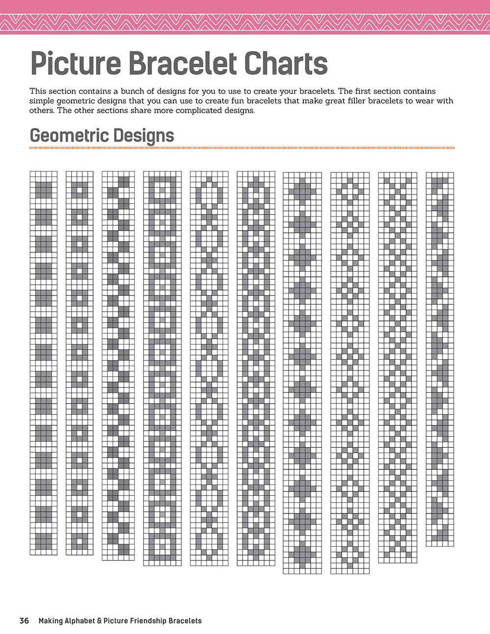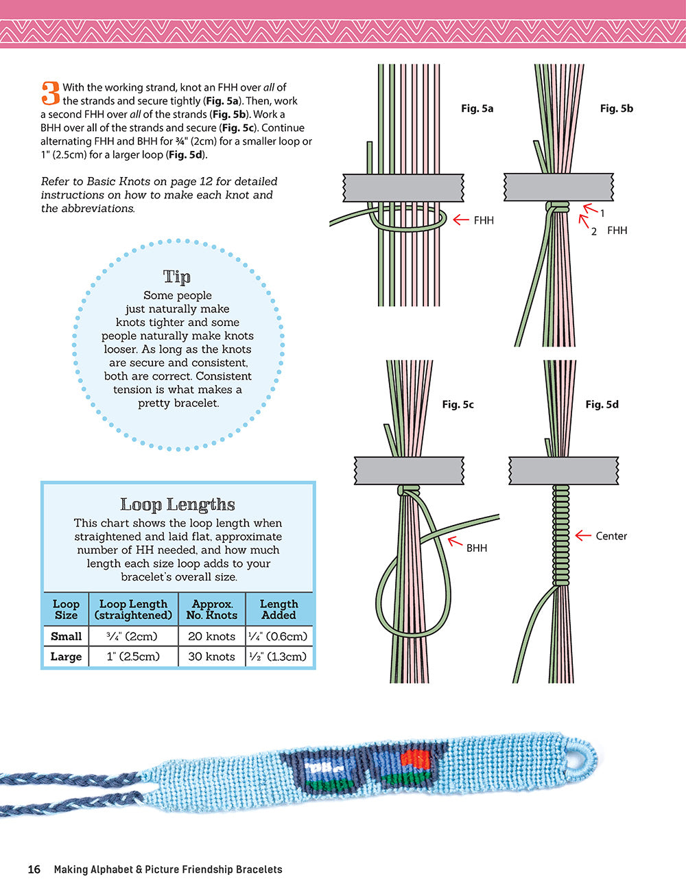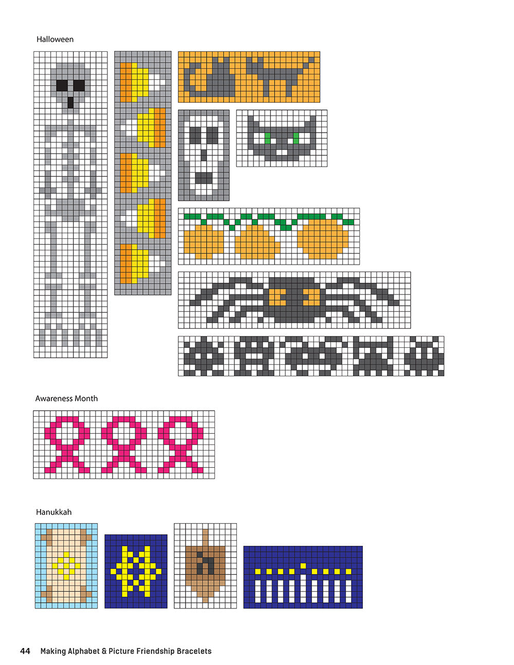 Explore different approaches for making pictures and changing thread color, depending on the difficulty of your bracelet design: Basic Bracelets, Intermediate Bracelets, Advanced Bracelets, Multicolor Bracelets, Ending a Bracelet (pictured)