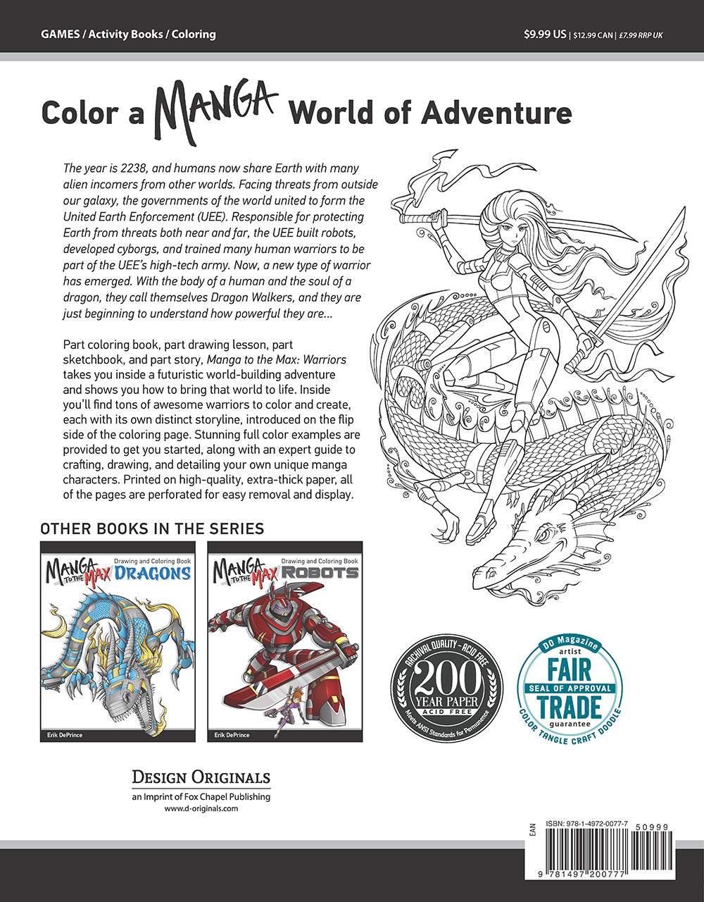 Enter a fun world of manga adventure as you color fearless warriors! More than just a coloring book, Manga to the Max Warriors takes you inside a fully developed world-building adventure. And by coloring the pages, you get a chance to bring that world to life. The narrative begins with a dynamic introduction to a new fantastic world. There you’ll meet 32 awesome manga characters to color and create. These warriors come with their own distinct storylines, introduced on the flip side of the coloring page. Ten pages of fully colored design examples are provided to get you started, along with a handy guide to manga drawing and coloring techniques. Printed on high-quality, extra-thick paper, all of the pages are perforated for easy removal and display.