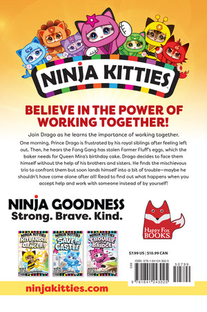 Kids will love this exciting new graphic novel for children! In this Ninja Kitties story, children will learn about the power of teamwork! One morning, Prince Drago is feeling frustrated and unappreciated by his royal siblings. When he later gets word the Fang Gang has stolen Farmer Fluff's eggs that Baker Baku needs to bake the Queen's birthday cake, he decides to handle the problem himself without any help. After confronting the Fang Gang using up all the stolen eggs to cook for themselves, Drago quickly learns he shouldn't have come alone. Will any of the other Ninja Kitties realize Drago needs help? Will the Fang Gang eat all the eggs and ruin the Queen's birthday cake? Read and find out!