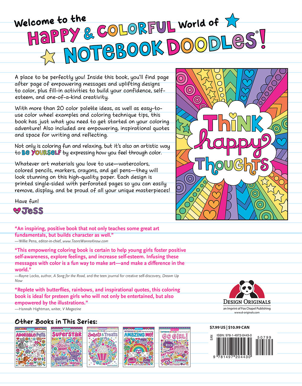 Jess Volinski is the best-selling author/illustrator of the Notebook Doodles® coloring book series designed to encourage creativity and build self-confidence in tweens and young adults. She also creates stickers, cards, and other fun products designed to make people smile. Jess lives in New Jersey with her husband Erik, who is also an illustrator, and their two very creative children