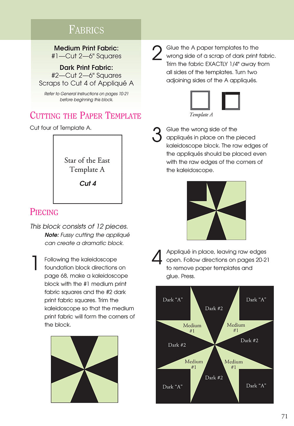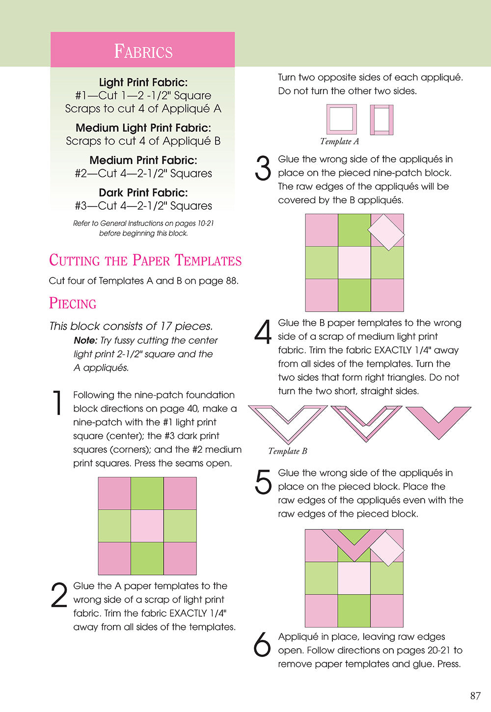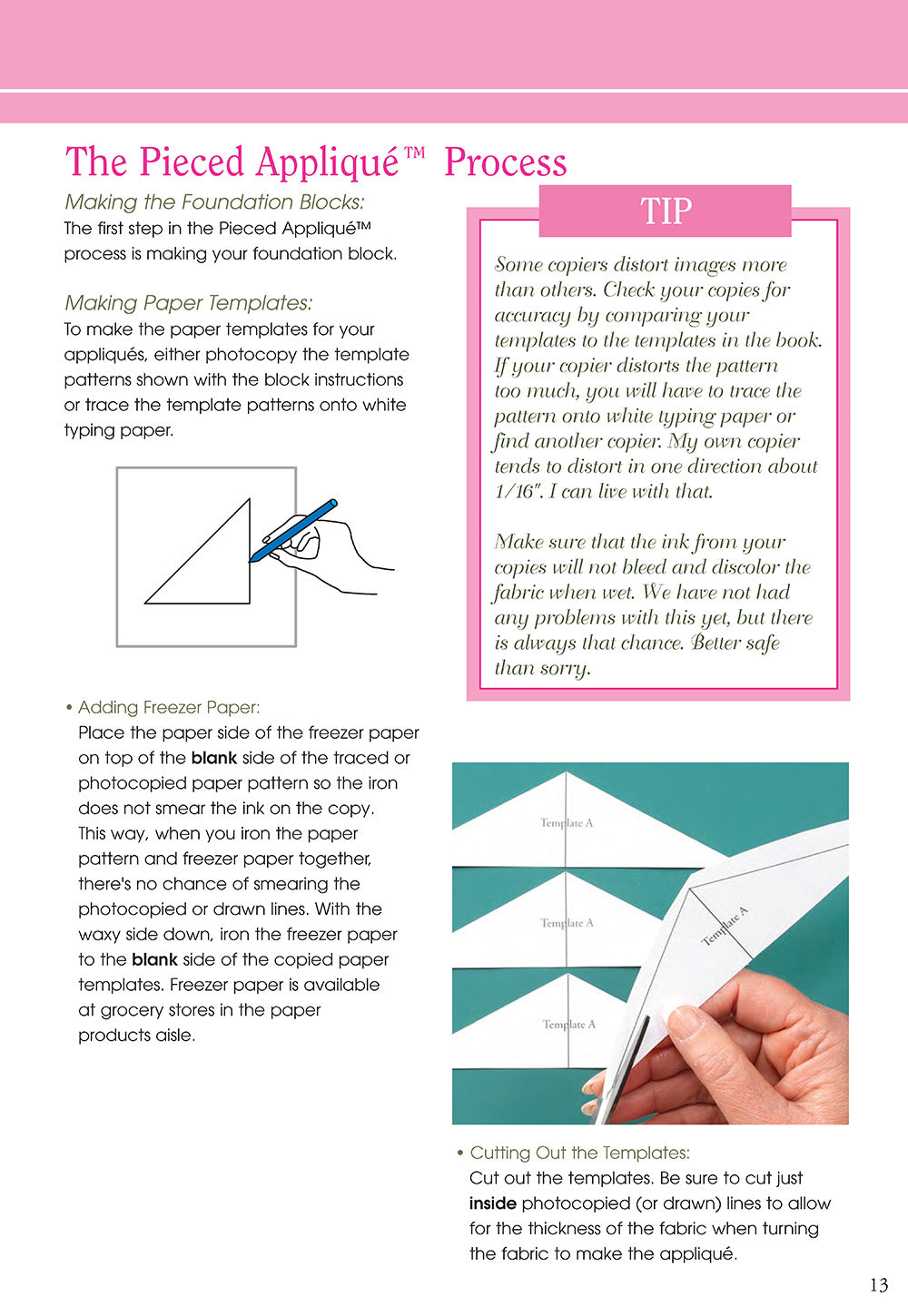 You may never look at a block pattern the same! Take the mystery out of creating intricate blocks with Penny Haren’s Pieced Applique and her amazingly simple techniques. Begin with 9 basic foundation blocks, follow 5 simple steps, and turn them into 25 “Wow! How did you do that?” blocks that look more complicated than they actually are. Create flawless points and curves with no inset seams and achieve immediate success! Full-size templates are provided, as well as clear step-by-step instructions, full-color diagrams, and three color options. Penny’s innovative techniques prove that it’s so much easier than the traditional way!