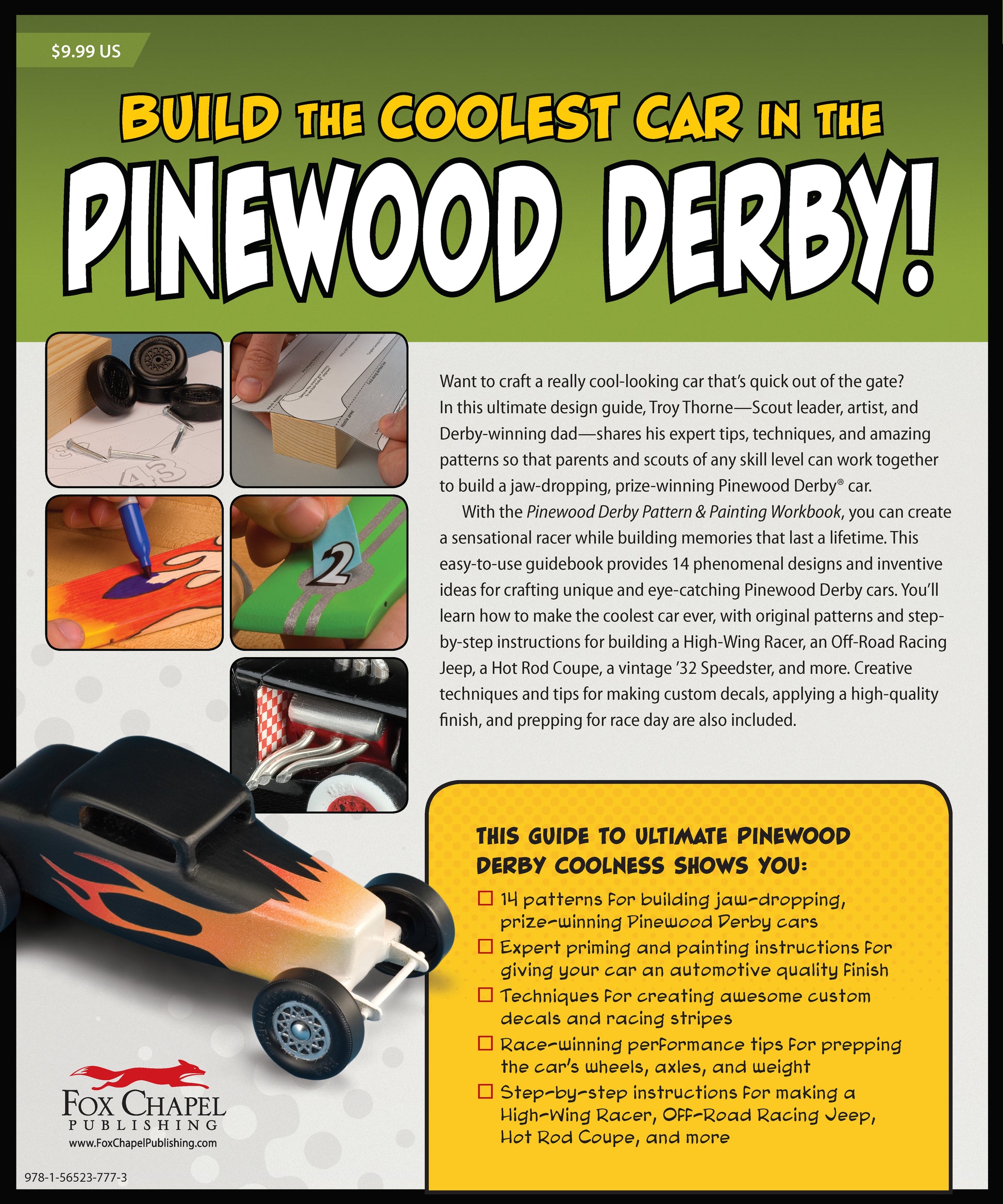 This easy-to-use guidebook provides 14 sensational designs and inventive ideas for crafting unique and eye-catching Pinewood Derby cars. You'll learn how to make the coolest car ever, with original patterns and step-by-step instructions for building a High-Wing Racer, an Off-Road Racing Jeep, a Hot Rod Coupe, a vintage '32 Speedster, and more. Creative techniques and tips for making custom decals, applying a high-quality finish, and prepping for race day are also included.