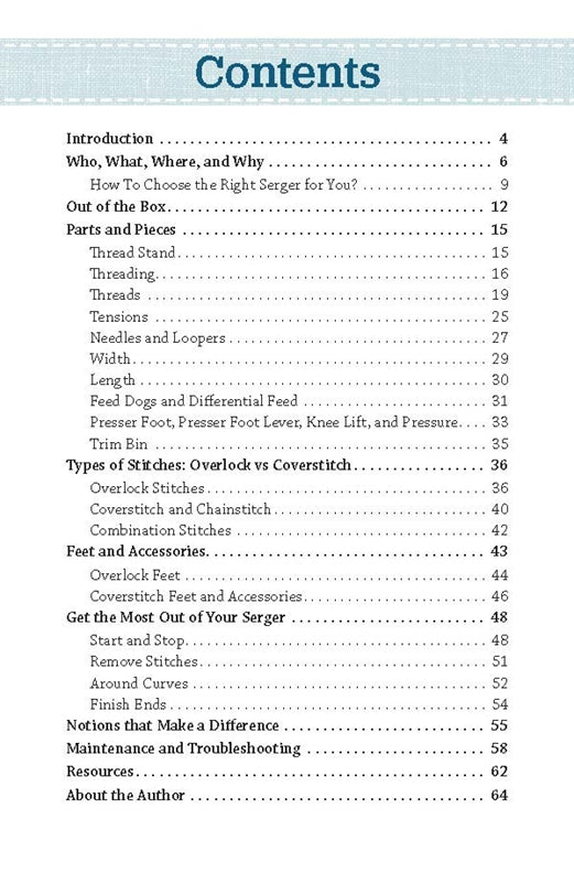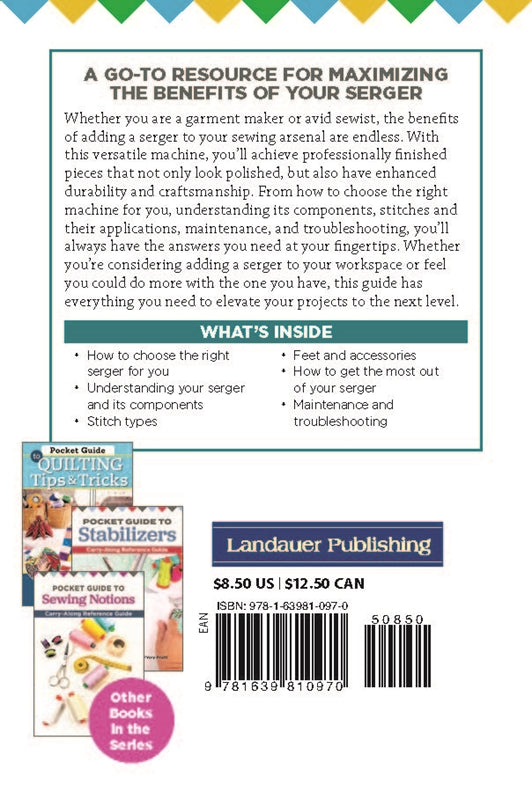 Pocket Guide to Sergers is an invaluable guide for both new and experienced seamstresses and tailors. It's a perfectly small, handy, take-along primer that includes all of the basics for getting the most out of the serger machine. Sergers are more than a one-trick pony for sewing basic finishing seams that won't unravel. They can do so much more than that like gathering, cording, cover stitching, and ruffles, to name a few. This must-have book will help you master these techniques. This perfect-sized compact guide will teach you what a serger is and help you decide which one is the best for you to purchase. It also provides information on parts and pieces of the serger, tensions, needles and loopers, types of stitches, feet and accessories, getting the most out of your serger, and maintenance and troubleshooting. With so much information, this guide will quickly become your favorite.