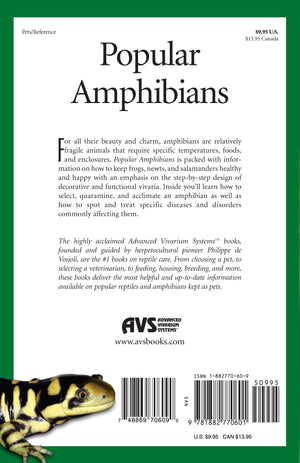 Frogs, toads, salamanders, and newts are among pet owner’s favorite amphibians, and this colorful guide proves the perfect introduction to these fascinating animals. Author Philippe de Vosjoli provides guidelines for keeping the most popular species of amphibians, highlighting Oriental fire-bellied toads, leopard frots, dwarf clawed frogs, fire-bellied newts, and tiger salamanders. For each he provides insight into commonly kept species, systematics, distribution and origins, size, longevity, sexing, housing, feeding, behavior, breeding, and more. This Advanced Vivarium Systems title includes information about selecting a healthy example, quarantine and acclimation considerations, housing needs, water and feeding, as well as solid advice about keeping the amphibian healthy. A separate chapter on diseases and disorders provides a complete primer on the health needs and veterinary care of these rewarding amphibians.