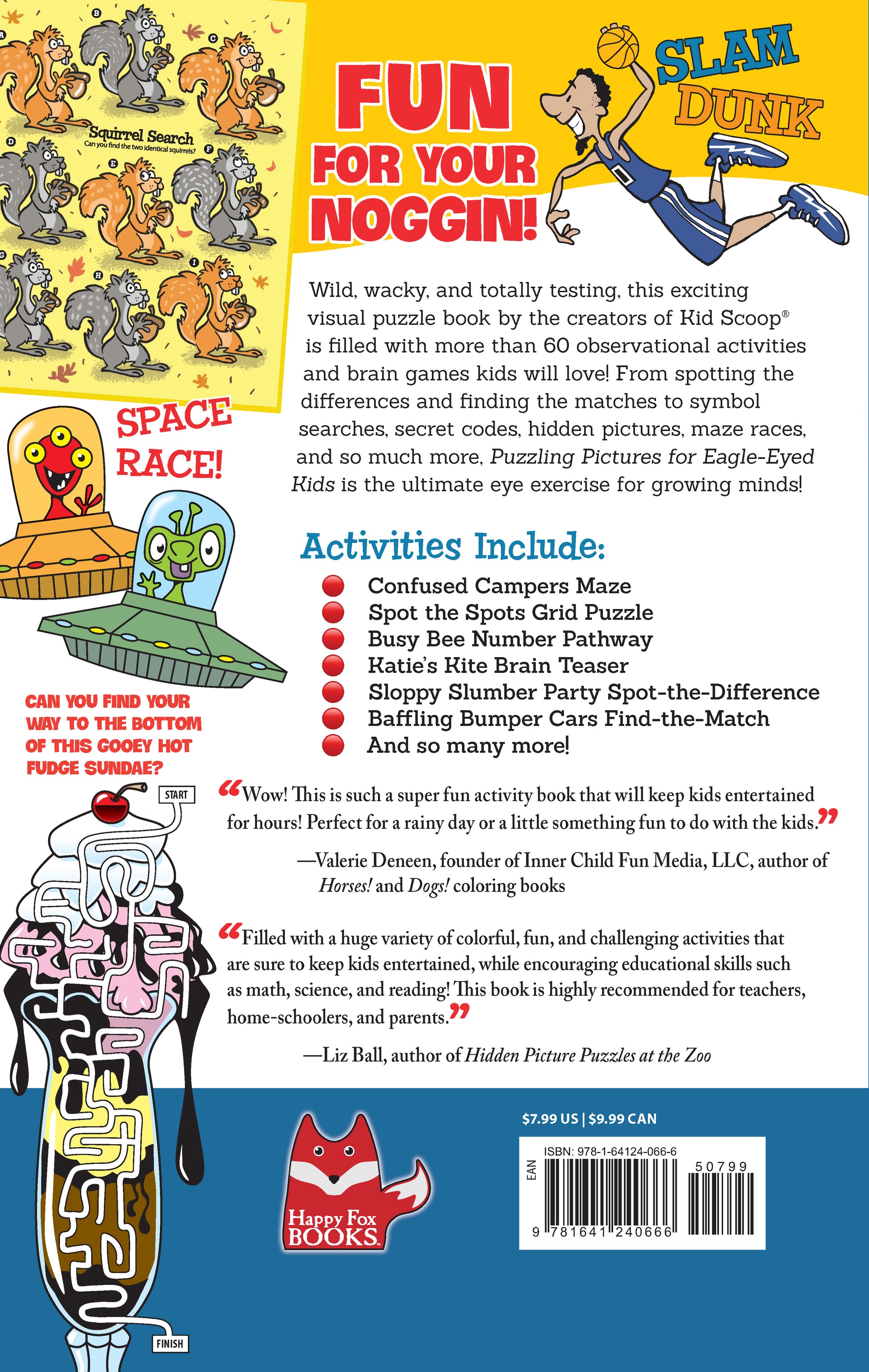 The ultimate visual challenge, children will love scrutinizing every page inside Puzzling Pictures for Eagle-Eyed Kids! From the creators at Kid Scoop®, this exciting puzzle book is filled with 60 engaging observational activities, including brain teasers, spot the difference, complete the pattern, find the friend, and hidden object games. Each visual activity is designed to develop children’s observational skills, making this activity book for kids the perfect resource for challenging young minds and having fun and being entertained for hours! Author Vicki Whiting is the founder and president of Kid Scoop, an award-winning educational page where illustrator Jeff Schinkel is creative director.