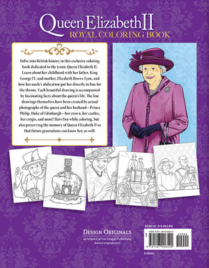 A unique keepsake and tribute to Queen Elizabeth II, this one-of-a-kind coloring book for adults encompasses nearly 71 years of her life and reign. Featuring 32 stunning line art designs that span from Queen Elizabeth's younger years to her historical moments, public appearances, royal properties, and even commemorative mailing stamps, this coloring book also includes fascinating facts about her legacy as queen, personal information about her beloved pets and favorite flowers, food, and more! Opening with an informative 8-page section on the history of her monarchy, accompanied by full-color images, Queen Elizabeth II Royal Coloring Book is an informative yet creative coloring experience for all to enjoy as they remember the amazing life of the queen.
