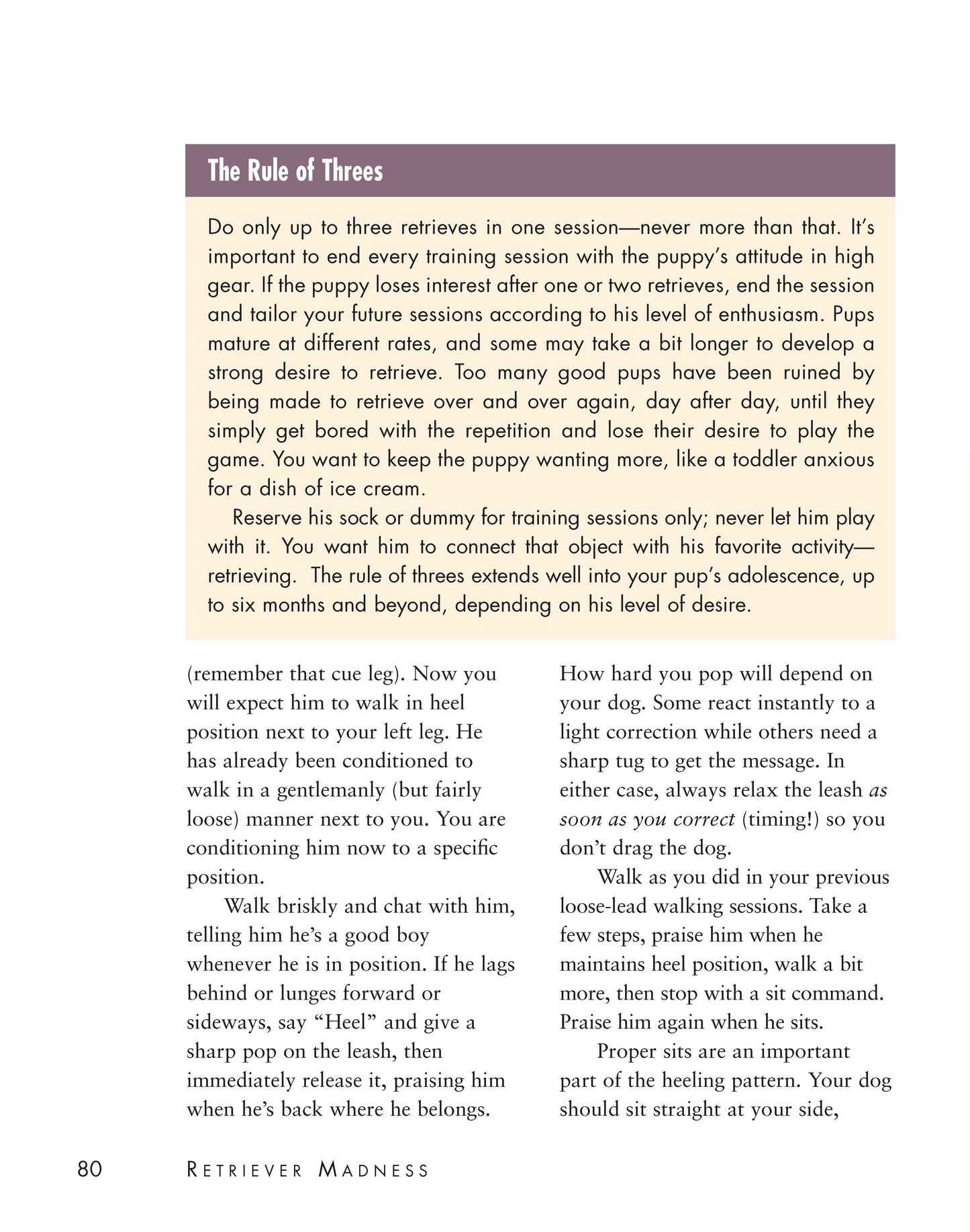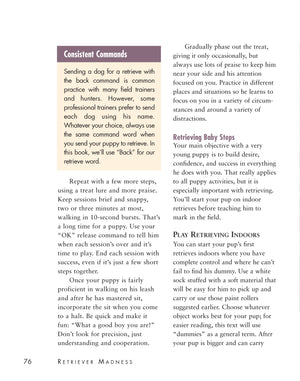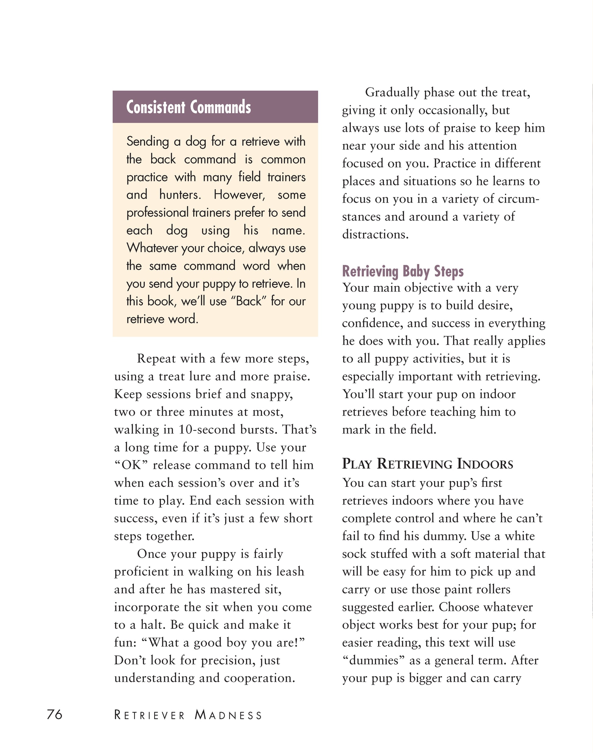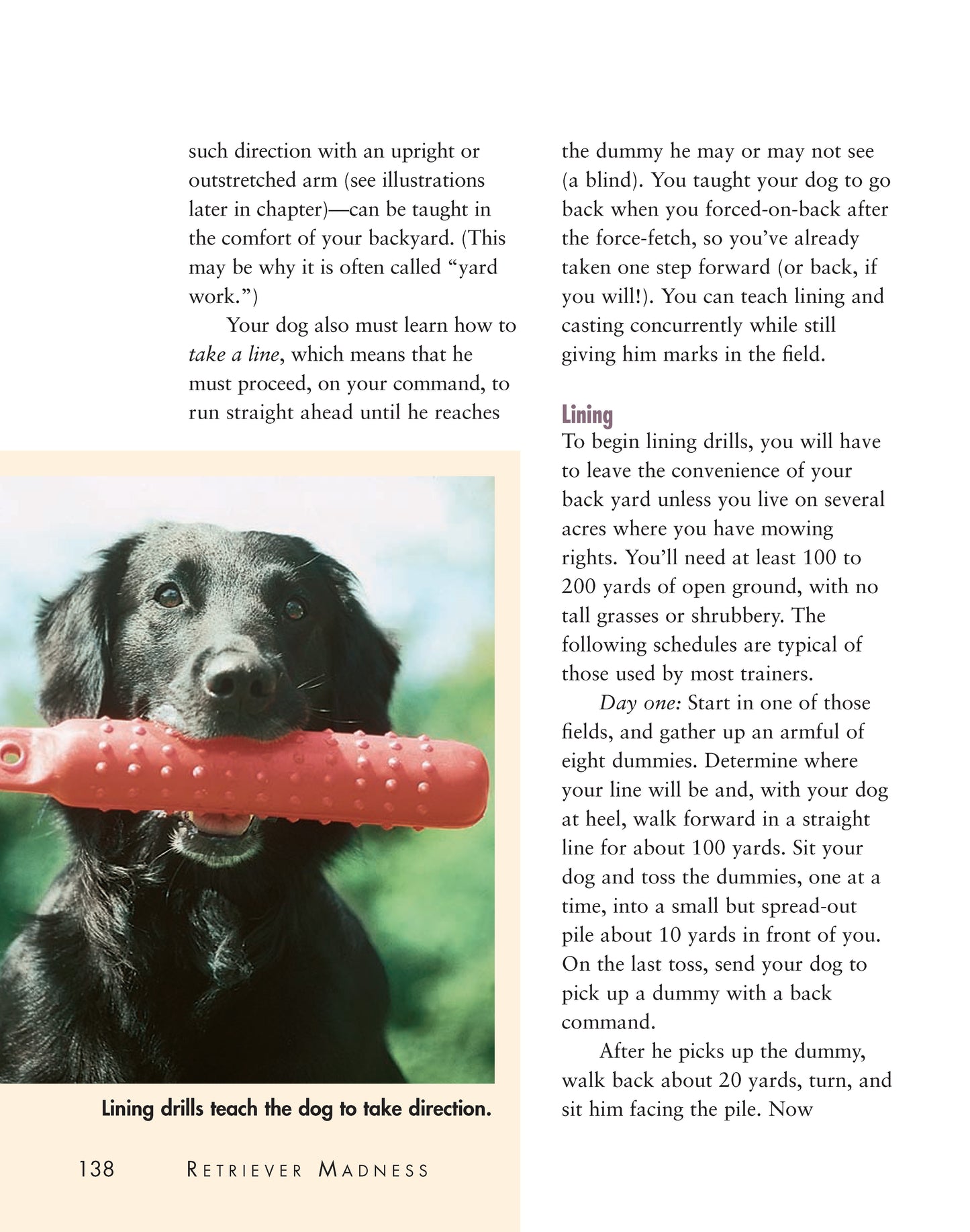 Author Nona Kilgore Bauer begins Retriever Madness with a chapter called ?Know Your Retrievers,” and few know their retrievers like this expert author, trainer, and breeder. Bauer introduces the readers to the six retrievers recognized by the American Kennel Club, among them two of the most popular companion dogs in the world, the Labrador Retriever and the Golden Retriever, along with other superb overachievers: the Chesapeake Bay Retriever, Flat-Coated Retriever, Curly-Coated Retriever, and Nova Scotia Duck Tolling Retriever.Geared toward readers who are interested in working with their retrievers in their bred-for capacity?hunting water fowl and upland game birds?Retriever Madness is the perfect primer to getting started in the field. The book offers advice on selecting a puppy with hunting potential, giving future owners insight on how to evaluate a puppy’s birdiness, independence, prey drive, and personality. The chapter on bringing the puppy home gives recommendations for basic training equipment, including leashes, collars, dummies, whistles, starting pistol and the like.Amateur retriever owners who hope to hunt with their dogs will find excellent advice for training for the puppy’s first twenty weeks of life, the most critical period for training any puppy. In addition to the basic commands (sit, down, stay), the