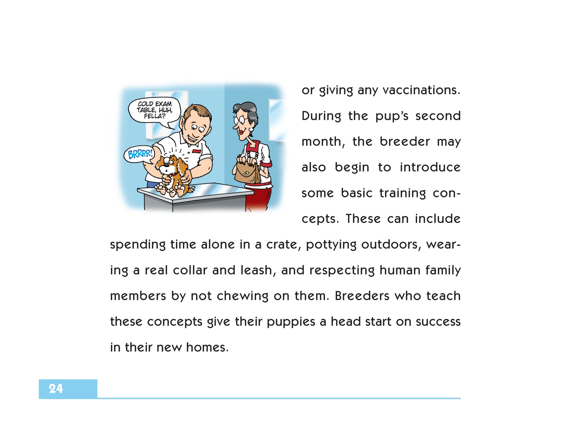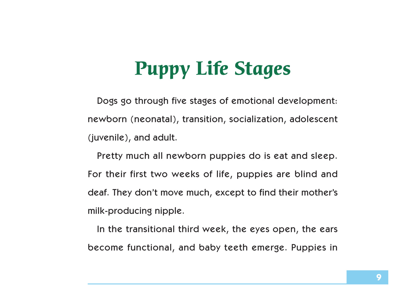 As author Kim Campbell Thornton begins this Simple Solutions guide, ?Dogs are known as man’s best friend, but they don’t come ready-made to take on this role.” Socialization unlocks the key to the human-dog bond and explains how well-mannered, well-adjusted dogs are made (not born). A term used by canine behaviorists and trainers, socialization is a fancy five-syllable word for ?getting friendly,” which doesn’t come naturally to all dogs. This handy little book begins with a discussion of puppy life stages, showing how puppies developmentally mature and what their ever-changing needs are. New puppy buyers must be aware of the importance of the breeder’s role in socializing a litter of puppies, a critical process of introducing each pup to people, other dogs, and common everyday noises, during its critical developmental stages. Puppies raised without socialization (typically in a commercial breeding establishment, sometimes called a puppy mill) have a decided disadvantage and may never develop into normal, well-adjusted dogs. The book gives the new dog owner advice about planning social outings for the puppy so that he has ?People to Meet, Places to Go,” ever expanding his social graces and comfort level with strangers and the not-so-scary-after-all unknown. The author also