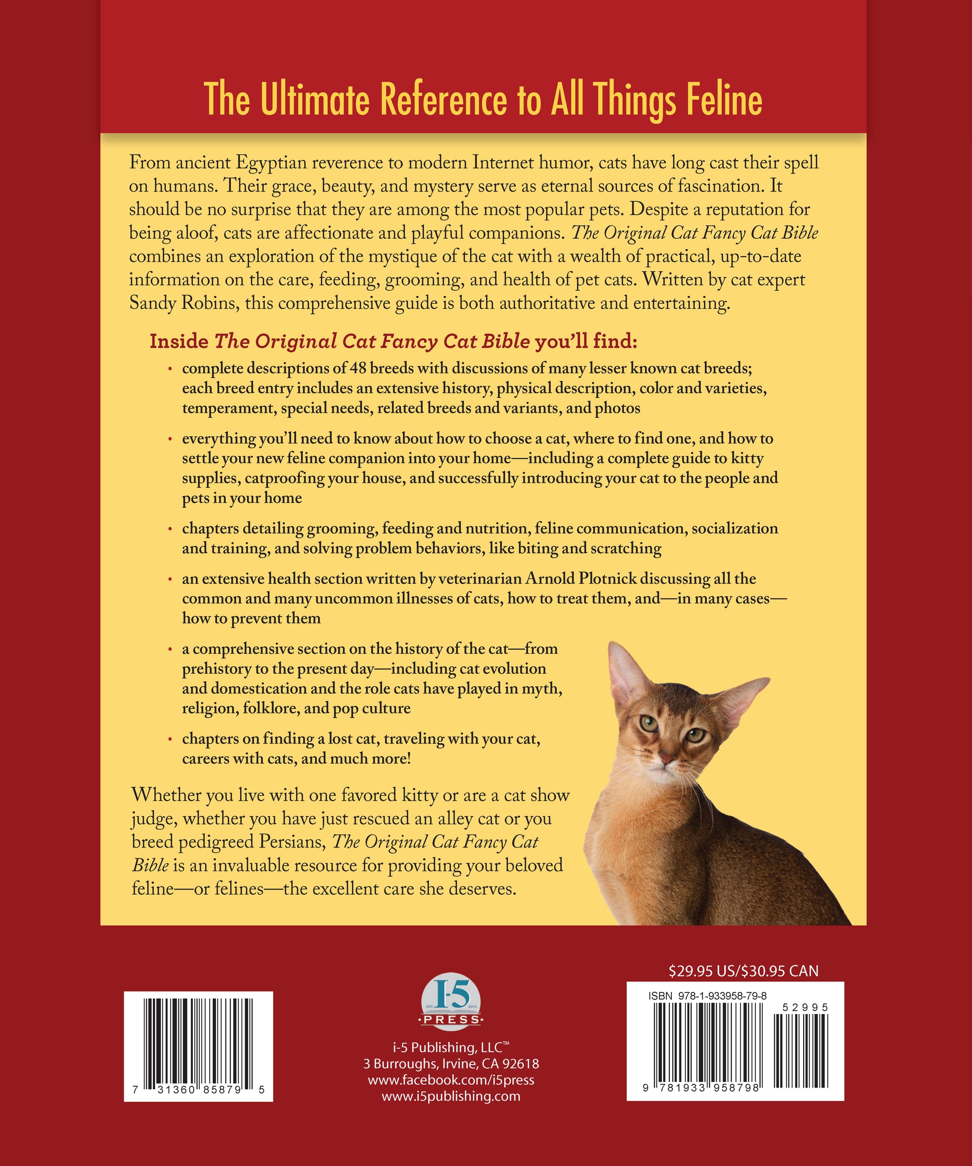 Following in the paw- and hoof-prints of I-5’s best-selling The Original Dog Bible and The Original Horse Bible comes The Original Cat Bible, the ultimate resource for cat owners and lovers from the editors of Cat Fancy magazine. This new 500-page volume promises to be the most complete and authoritative book of its kind, authored by award-winning writer Sandy Robins with special veterinary chapters by Dr. Arnold Plotnick and an extensive breed section by Sarah Hartwell and Lorraine Shelton. The Original Cat Bible delves deeply into all things feline, from the domestication of cats and the development of pure breeds to the anatomy and genetics of felines. Between its two covers, it bequeaths a wealth of information to the cat fanciers, detailing all aspects of cat care and ownership, bejeweled with fun tidbits and trivia to entertain even the most discerning of feline lovers.The book begins with a detailed history of the modern cat, including the noble big cats of the wild and the small domesticated cats adored indoors by millions around the world. In her venture into the modern-day world of cats, the author discusses the genesis of cat welfare and rescue, as well as concerns about stray and
