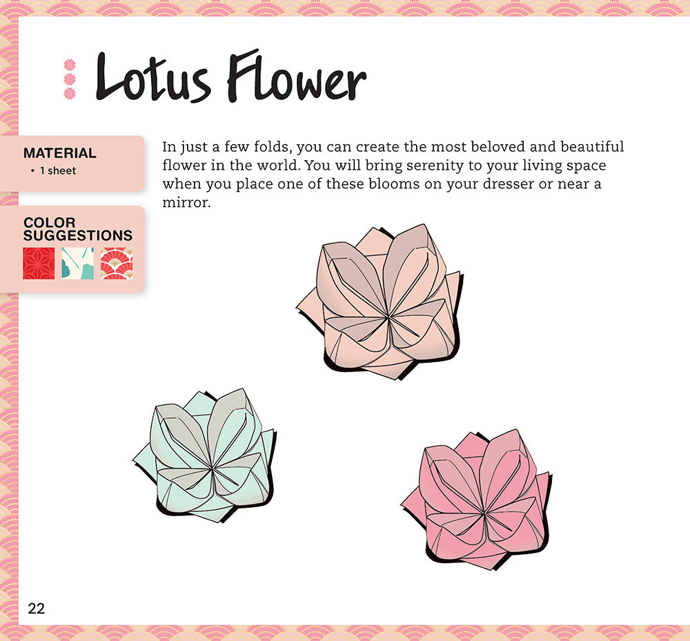 Everything you need to learn how to make origami is all right here! From fish, flowers, and boats to butterflies, birds, and even Mount Fuji, this exciting, all-in-one origami book features 20 step-by-step projects with clear illustrations to show you how to make stunning paper creations. With every origami project comes a special border design that matches with beautifully patterned, high-quality craft paper in the back of the book so you know which one to use. With 184 colorful and perforated pages to easily pull out and fold, the possibilities are endless with this one-of-a-kind paper folding guide!