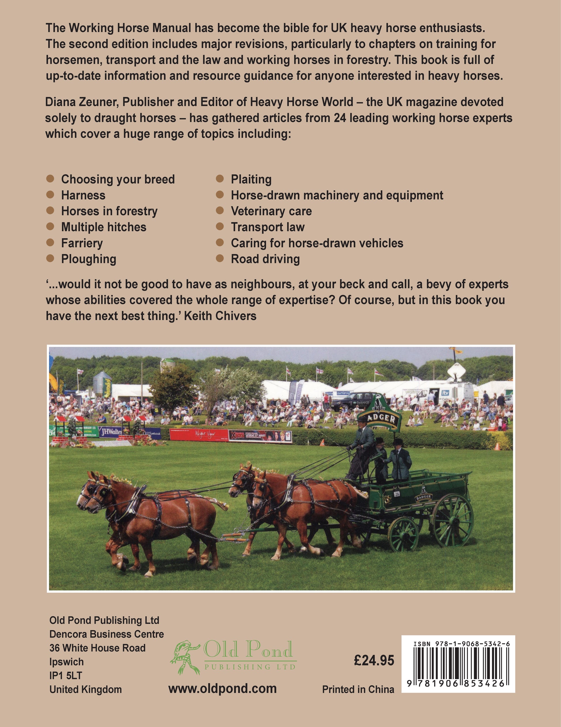 This superb book was initially published in 1998 and has been out of print for several years. This new edition has been updated to show the most recent developments in all areas relating to the heavy horse industry. The Working Horse Manual has been designed to act as bible for heavy horse enthusiasts. Diana Zeuner has collected articles from 24 leading heavy horse experts who, between them, have covered a wide array of topics including: o Choosing your breed o Harnesses and harnessing o Horses in forestry o Multiple hitches o Farriery o Ploughing o Plaiting o Horse-drawn machinery and equipment o Veterinary care o Transport law o Caring for horse-drawn vehicles o Road driving For this new edition the chapters about Training for Horsemen, Working Horses in Forestry and Transport and the Law have been completely updated to reflect recent changes. The rest of the book has also been amended accordingly. This new edition also has an increased section on cross-country driving and an improved 'useful addresses' section. The book is highly illustrated with photographs and diagrams. The Working Horse Manual is the only UK book of this type and is on the recommended reading list of the British