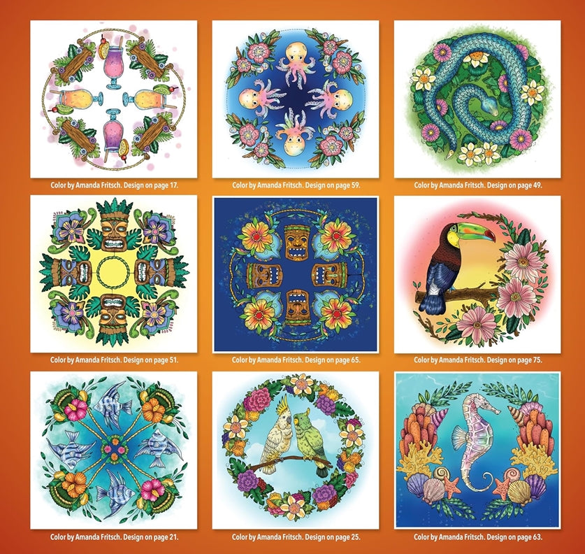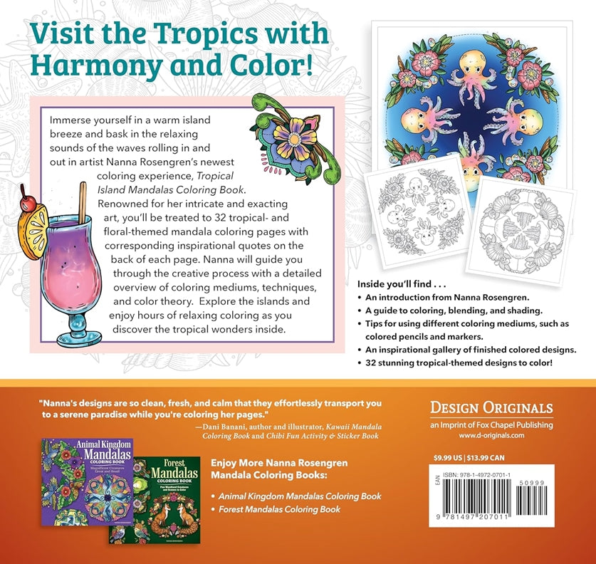 Artist Nanna Rosengren creates a relaxing coloring escape in her newest adult coloring book, Tropical Mandalas Coloring Book. Renowned for her intricate and exacting art, the book features 32 tropical and floral themed designs. From tikis and lobsters to starfish, flamingos, and tropical libations you'll feel as though you've been whisked away to your own tranquil forest. For those looking for creative inspiration, Nanna includes coloring technique tips along with a full-color gallery of each completed design. Each coloring page is printed on one-side of acid-free museum quality paper with perforated edges for easy removal and display. The back side of the page holds an inspirational quote related to the design and book's tropical theme.