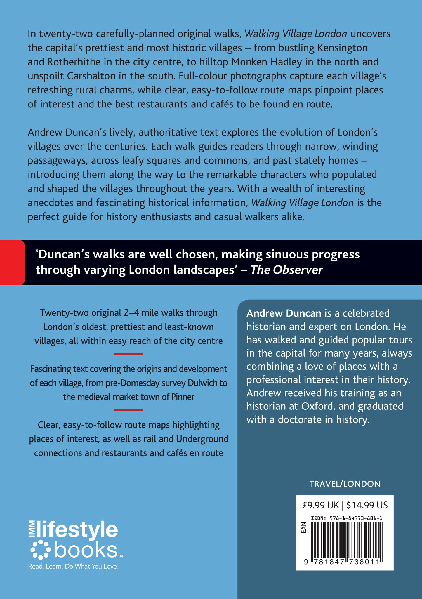 In 22 carefully planned walks, Walking Village London uncovers London’s prettiest and most historic villages—from bustling Kensington to Rotherhithe in the city center, to hilltop Monken Hadley in the north and unspoiled Carshalton in the south. Full color photographs capture each village’s refreshing rural charms, while clear easy-to-follow maps pinpoint places of interest and the best restaurants and cafés to be found en route. Andrew Duncan’s lively, authoritative text explores the evolution of London’s villages over the centuries. Each walk guides readers through narrow, winding passageways, across leafy squares and commons and past stately homes—introducing them along the way to the remarkable characters who populated and shaped the villages throughout the years. With a wealth of interesting anecdotes and fascinating historical information, Walking Village London is the perfect guide for history enthusiasts and casual walkers alike.