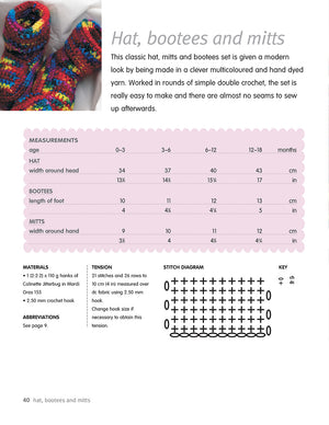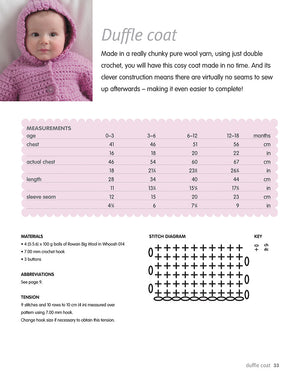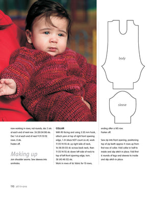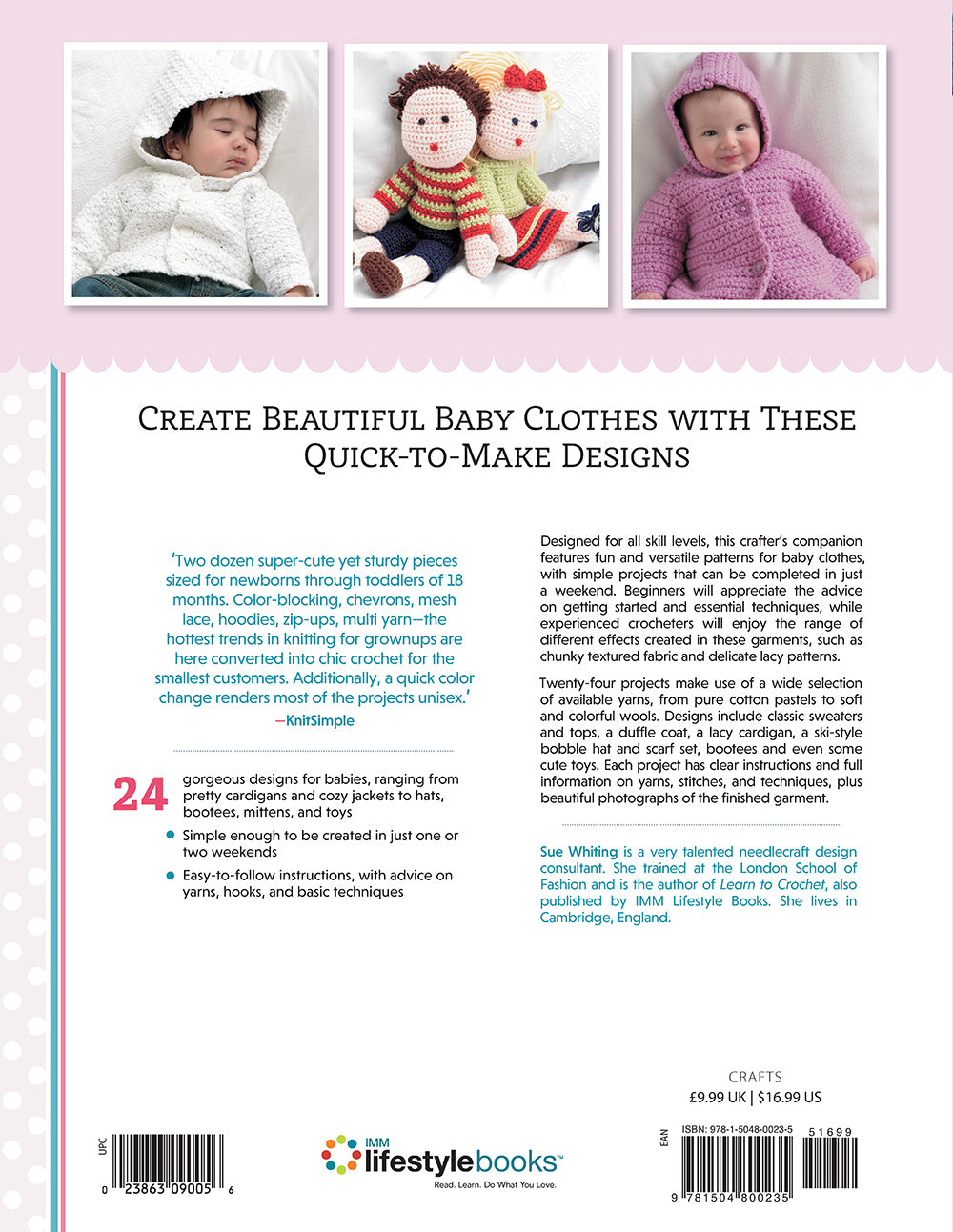 Designed for all skill levels, this crafter’s companion features fun and versatile patterns for baby clothes, with simple projects that can be completed in just a weekend. Beginners will appreciate the advice on getting started and essential techniques, while experienced crocheters will enjoy the range of different effects created in these garments, such as chunky textured fabric and delicate lacy patterns. Twenty-four projects make use of a wide selection of available yarns, from pure cotton pastels to soft and colorful wools. Designs include classic sweaters and tops, a duffle coat, a lacy cardigan, a ski-style bobble hat and scarf set, bootees and even some cute toys. Each project has clear instructions and full information on yarns, stitches, and techniques, plus beautiful photographs of the finished garment.