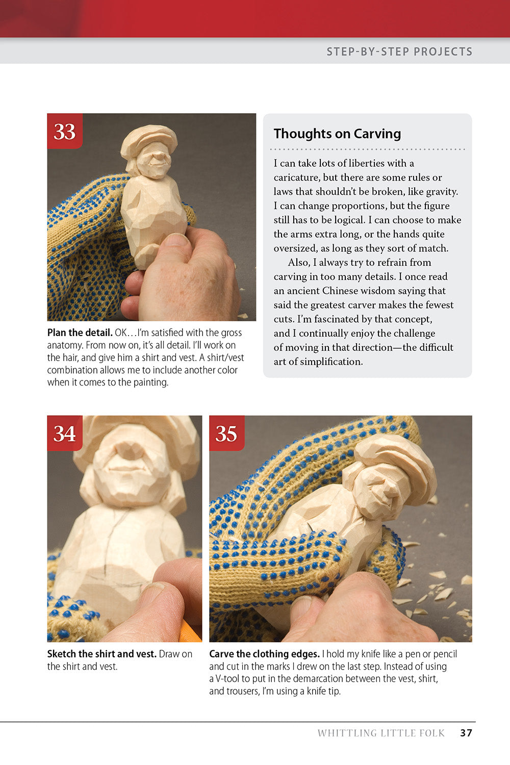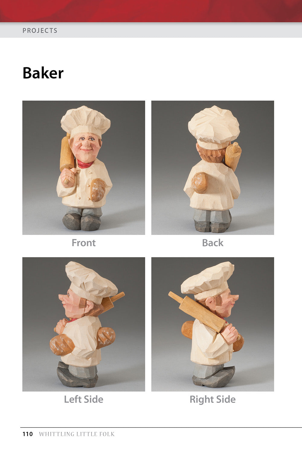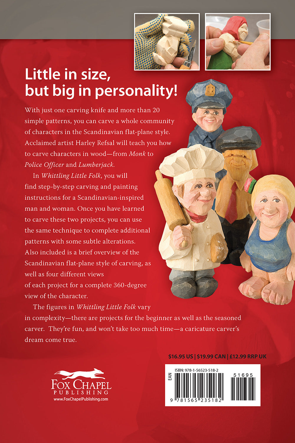 With just one wood carving knife and two simple patterns, you can carve a whole community of characters, including a policeman, hard-hat road worker, monk, baker, professor, football player, and more! Patterns for these delightful folks are included in Whittling Little Folk, written by the master of the Scandinavian flat-plane style of carving, Harley Refsal. The whittled little folk are full of personality and can be made by mastering Refsal's step-by-step instructions for Kristian, the Scandinavian husband donning a work shirt, and his wife, Thea, holding a broom. Once the couple is complete, carvers can use the same whittling techniques to complete 18 additional patterns, with some subtle alterations. Also included is a brief overview of the Scandinavian flat-plane style of carving, as well as instructions for painting each little whittle. Each pattern is presented with 4 perspectives - the front, back and both sides - for a complete 360-degree view of the character. While the whittling projects are easy to complete, and won't take up too much time, they sure don't lack personality. With their rosy cheeks, toothy smiles, humorous outfits and clever names, the little whittles are a caricature carver's dream come true.