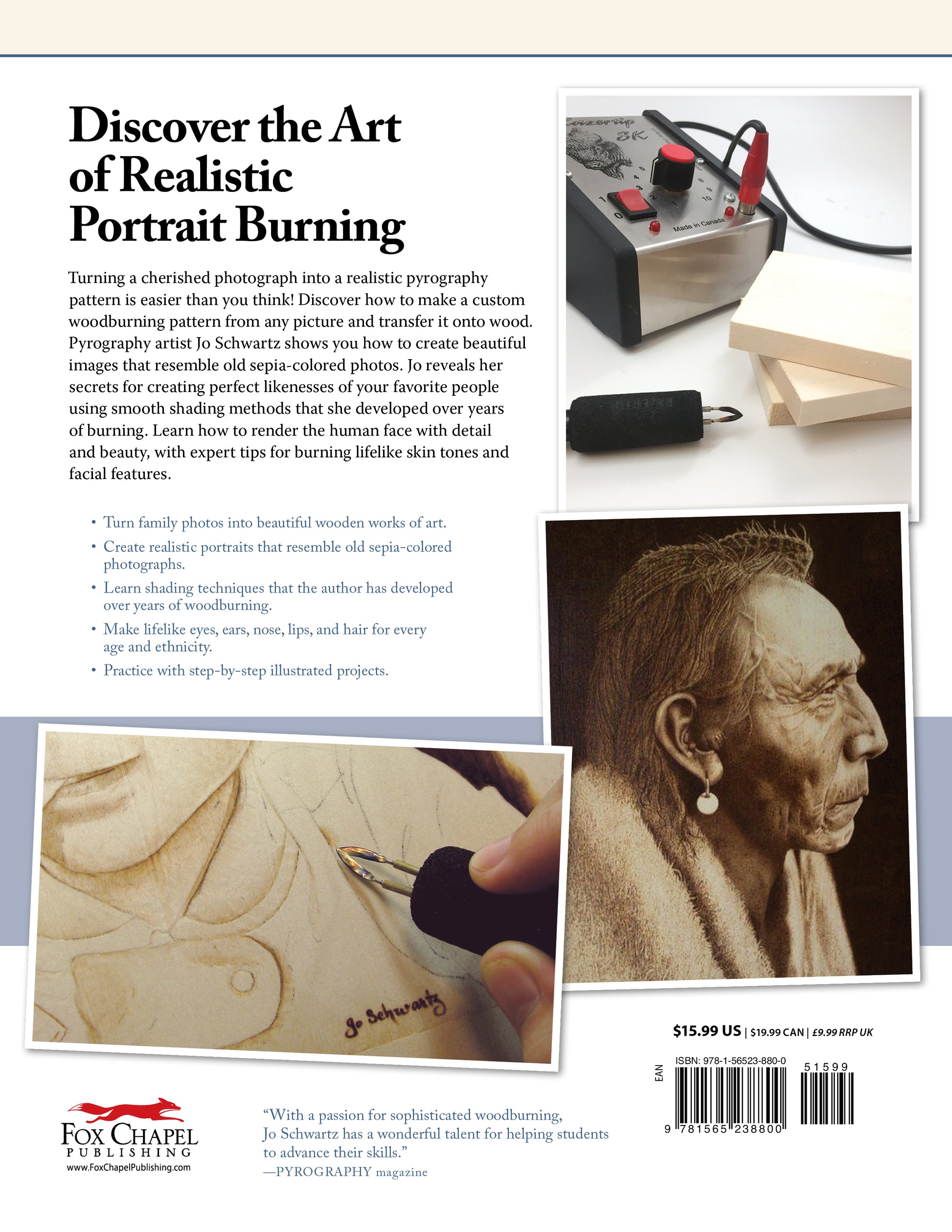 Turning a photograph of a loved one into a realistic pyrography pattern is easier than you think! Discover the art of portrait burning, and start creating perfect likenesses of your favorite people in wood. Pyrography artist Jo Schwartz reveals her dazzling techniques for turning photographs into custom portraits. She shows how to create beautiful images that resemble old, sepia-colored photos, using smooth shading methods that she has developed over years of burning. You’ll learn how to make a custom woodburning pattern from any picture and transfer it onto wood. Jo shows how to render the human face with detail and beauty, with expert tips for burning lifelike skin tones and facial features. She offers easy-to-follow instructions for creating expressive eyes, noses, mouths, ears, skin, and hair for every age and ethnicity. Practice what you’ve learned with a step-by-step, illustrated project.