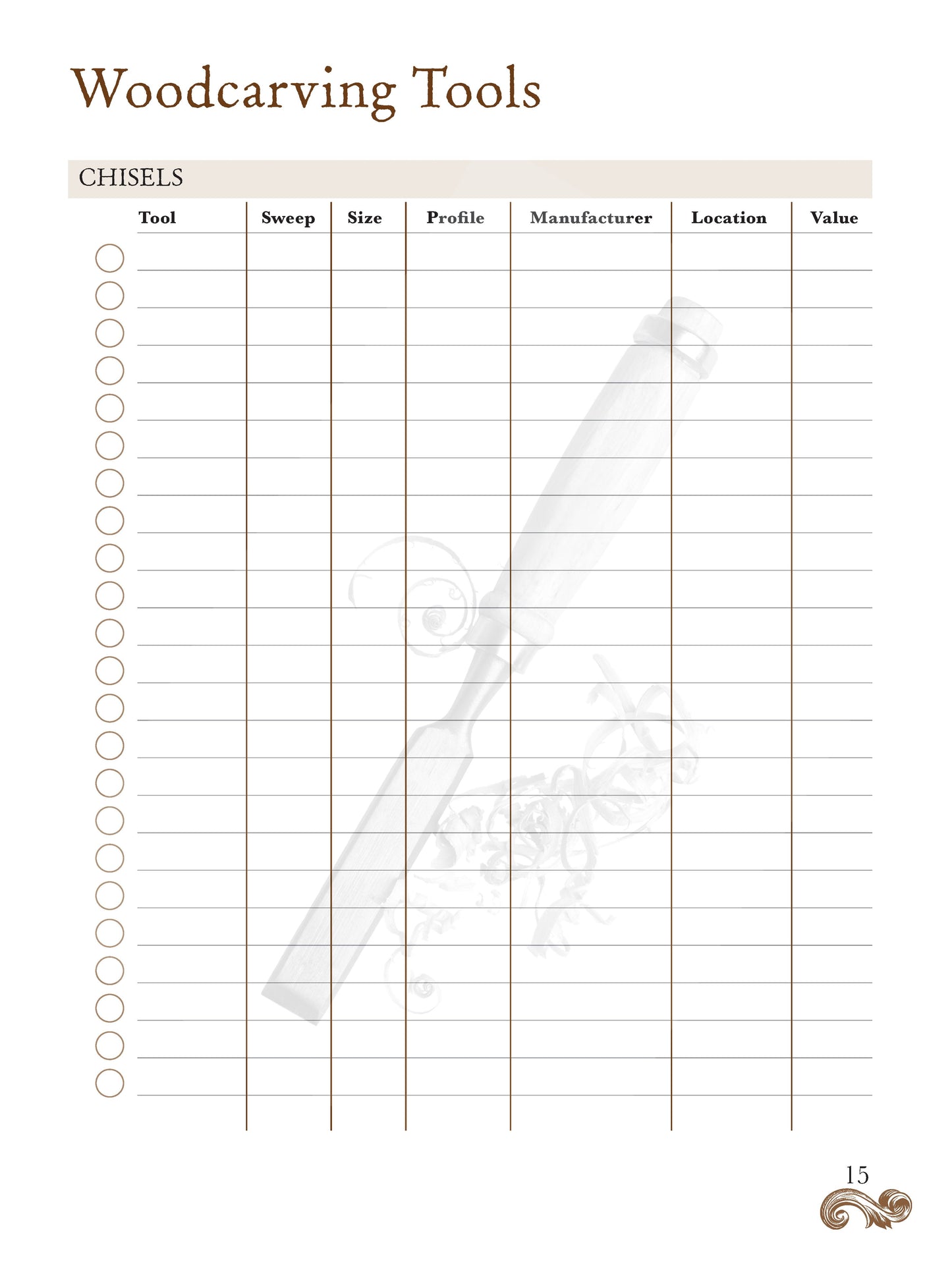 Now woodcarving enthusiasts have a handy way to organize their favorite hobby! This sturdy new shop journal allows you to preserve a permanent record of what you make and how you make it. Over time, it’s hard to remember everything that goes into even the most memorable project—the materials, methods, tools, sketches, lessons learned, and more. Use your shop journal to keep all of this information organized and accessible for successful repeat projects. Tool checklists make it easy to keep track of what you already have in the shop, and what you may need to look for at the next yard sale. With a handsome foil-stamped leather-look hardcover, Woodcarver’s Shop Journal also features specialized quick-reference tables and a blank table of contents for you to customize over time.